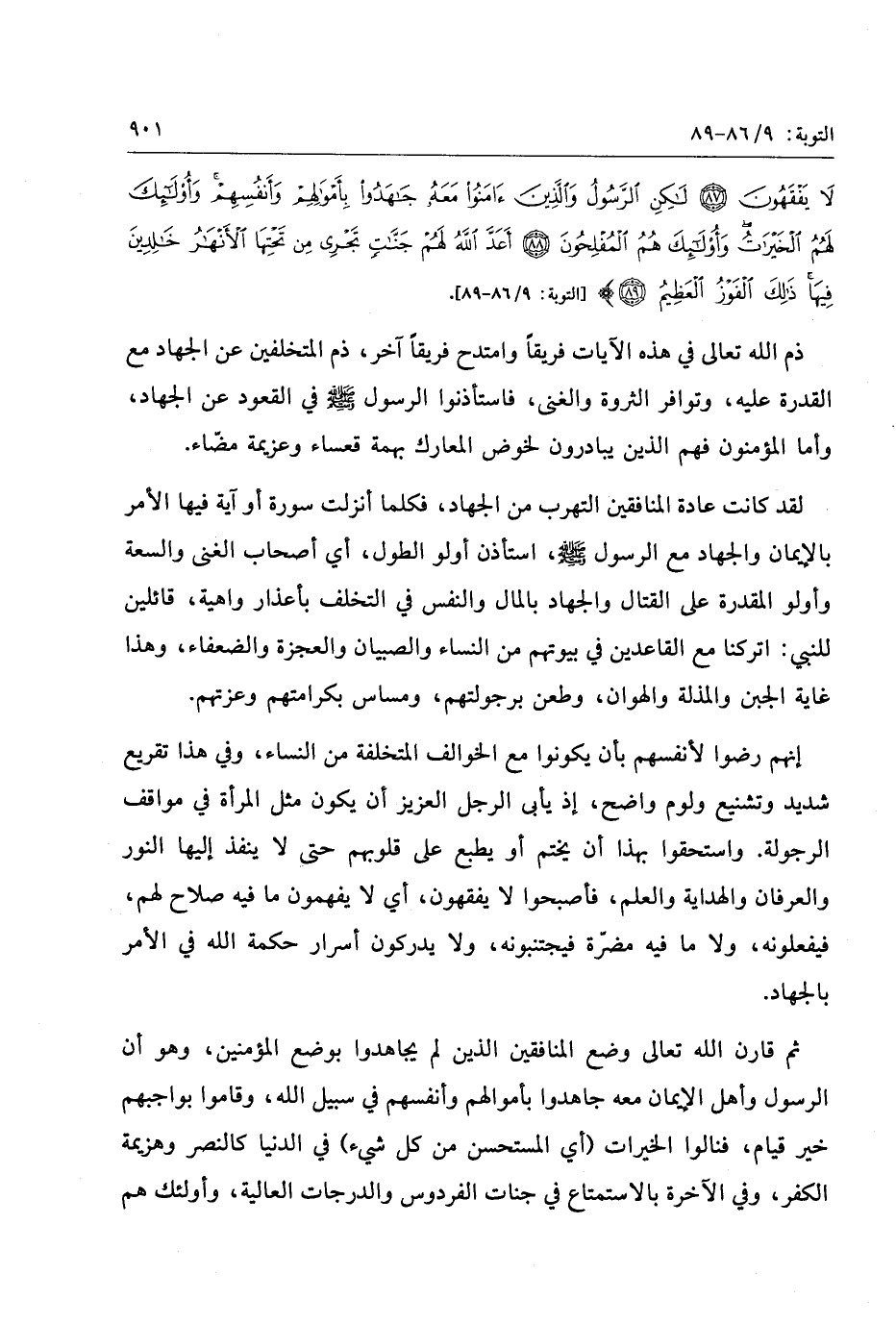 ذم الله تعالى في هذه الآيات فريقا وامتدح فريقا آخر، ذم المتخلفين عن الجهاد مع القدرة عليه، وتوافر الثروة والغنى، فاستأذنوا الرسول صلّى الله عليه وسلّم في القعود عن الجهاد، وأما المؤمنون فهم الذين يبادرون لخوض المعارك بهمة قعساء وعزيمة مضّاء.