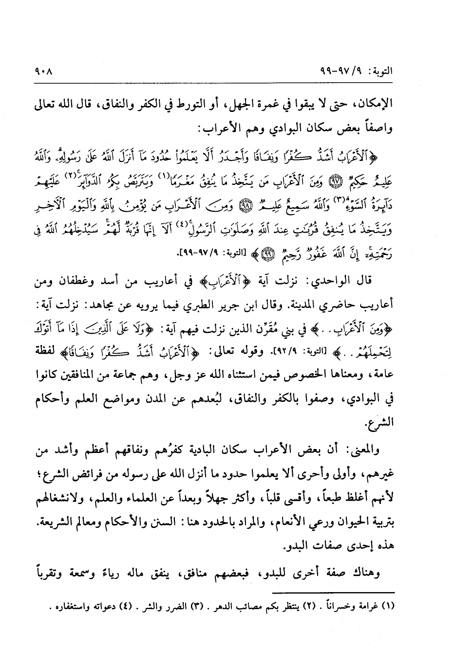 الْأَعْرابُ أَشَدُّ كُفْراً وَنِفاقاً وَأَجْدَرُ أَلاَّ يَعْلَمُوا حُدُودَ ما أَنْزَلَ اللَّهُ عَلى رَسُولِهِ وَاللَّهُ عَلِيمٌ حَكِيمٌ (97) وَمِنَ الْأَعْرابِ مَنْ يَتَّخِذُ ما يُنْفِقُ مَغْرَماً وَيَتَرَبَّصُ بِكُمُ الدَّوائِرَ عَلَيْهِمْ دائِرَةُ السَّوْءِ وَاللَّهُ سَمِيعٌ عَلِيمٌ (98) وَمِنَ الْأَعْرابِ مَنْ يُؤْمِنُ بِاللَّهِ وَالْيَوْمِ الْآخِرِ وَيَتَّخِذُ ما يُنْفِقُ قُرُباتٍ عِنْدَ اللَّهِ وَصَلَواتِ الرَّسُولِ أَلا إِنَّها قُرْبَةٌ لَهُمْ سَيُدْخِلُهُمُ اللَّهُ فِي رَحْمَتِهِ إِنَّ اللَّهَ غَفُورٌ رَحِيمٌ (99)
