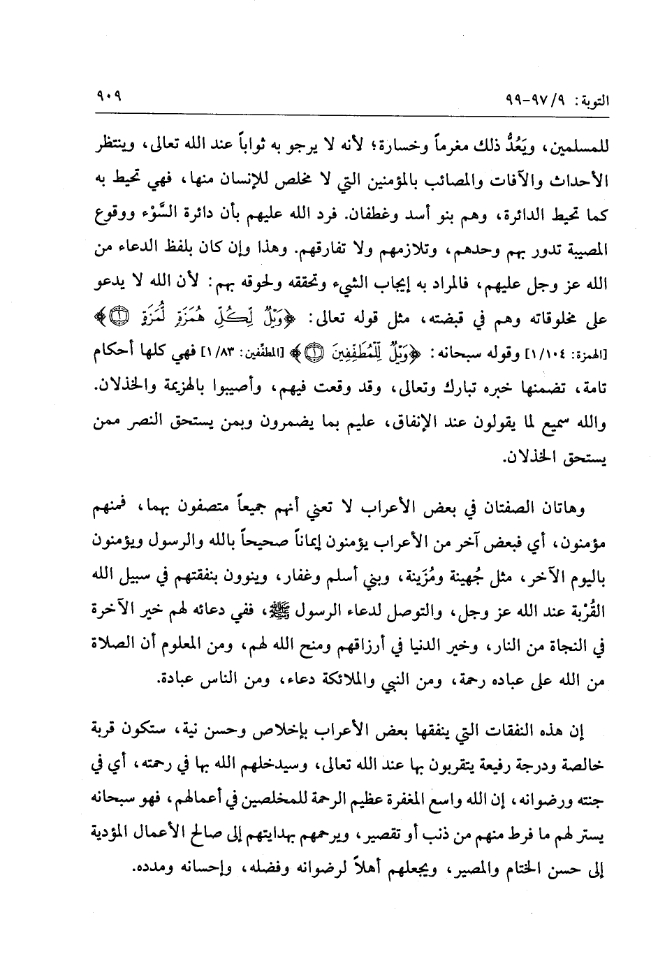 وهاتان الصفتان في بعض الأعراب لا تعني أنهم جميعا متصفون بهما، فمنهم مؤمنون، أي فبعض آخر من الأعراب يؤمنون إيمانا صحيحا بالله والرسول ويؤمنون باليوم الآخر، مثل جهينة ومزينة، وبني أسلم وغفار، وينوون بنفقتهم في سبيل الله القربة عند الله عز وجل، والتوصل لدعاء الرسول صلّى الله عليه وسلّم، ففي دعائه لهم خير الآخرة في النجاة من النار، وخير الدنيا في أرزاقهم ومنح الله لهم، ومن المعلوم أن الصلاة من الله على عباده رحمة، ومن النبي والملائكة دعاء، ومن الناس عبادة.