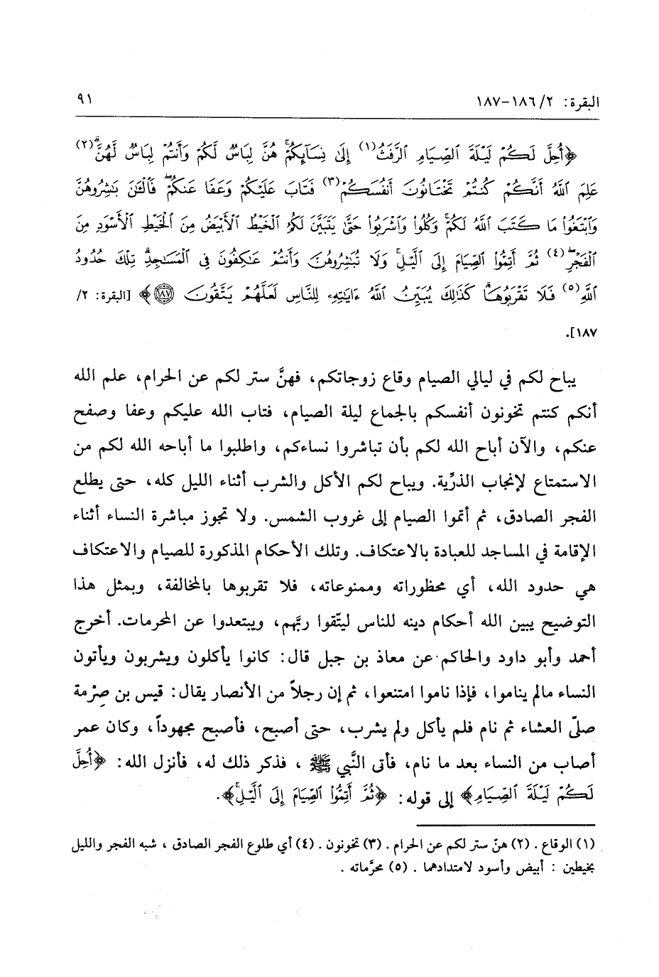 أُحِلَّ لَكُمْ لَيْلَةَ الصِّيامِ الرَّفَثُ إِلى نِسائِكُمْ هُنَّ لِباسٌ لَكُمْ وَأَنْتُمْ لِباسٌ لَهُنَّ عَلِمَ اللَّهُ أَنَّكُمْ كُنْتُمْ تَخْتانُونَ أَنْفُسَكُمْ فَتابَ عَلَيْكُمْ وَعَفا عَنْكُمْ فَالْآنَ بَاشِرُوهُنَّ وَابْتَغُوا ما كَتَبَ اللَّهُ لَكُمْ وَكُلُوا وَاشْرَبُوا حَتَّى يَتَبَيَّنَ لَكُمُ الْخَيْطُ الْأَبْيَضُ مِنَ الْخَيْطِ الْأَسْوَدِ مِنَ الْفَجْرِ ثُمَّ أَتِمُّوا الصِّيامَ إِلَى اللَّيْلِ وَلا تُبَاشِرُوهُنَّ وَأَنْتُمْ عاكِفُونَ فِي الْمَساجِدِ تِلْكَ حُدُودُ اللَّهِ فَلا تَقْرَبُوها كَذلِكَ يُبَيِّنُ اللَّهُ آياتِهِ لِلنَّاسِ لَعَلَّهُمْ يَتَّقُونَ (187)