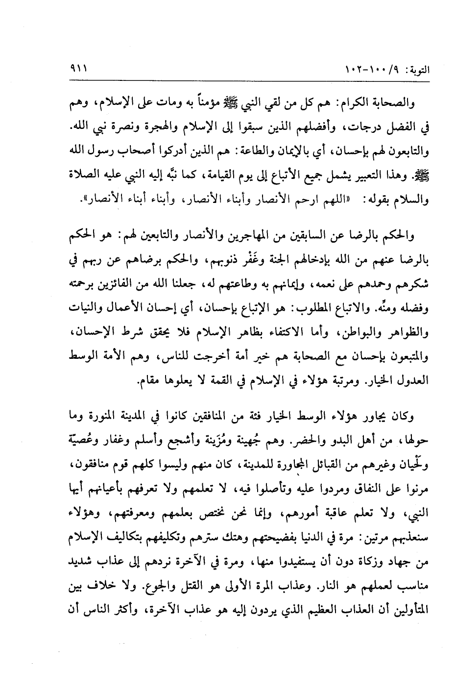 والتابعون لهم بإحسان، أي بالإيمان والطاعة: هم الذين أدركوا أصحاب رسول الله صلّى الله عليه وسلم. وهذا التعبير يشمل جميع الأتباع إلى يوم القيامة، كما