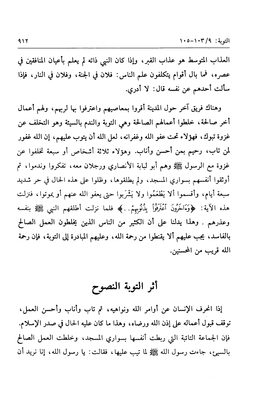 وهناك فريق آخر حول المدينة أقروا بمعاصيهم واعترفوا بها لربهم، ولهم أعمال أخر صالحة، خلطوا أعمالهم الصالحة وهي التوبة والندم بالسيئة وهو التخلف عن غزوة تبوك، فهؤلاء تحت عفو الله وغفرانه، لعل الله أن يتوب عليهم، إن الله غفور لمن تاب، رحيم بمن أحسن وأناب. وهؤلاء ثلاثة أشخاص أو سبعة تخلفوا عن غزوة مع الرسول صلّى الله عليه وسلّم وهم أبو لبابة الأنصاري ورجلان معه، تفكروا وندموا، ثم أوثقوا أنفسهم بسواري المسجد، ولم يطلقوها، وظلوا على هذه الحال في حر شديد سبعة أيام، وأقسموا ألا يطعموا ولا يشربوا حتى يعفو الله عنهم أو يموتوا، فنزلت هذه الآية: وَآخَرُونَ اعْتَرَفُوا بِذُنُوبِهِمْ.. فلما نزلت أطلقهم النبي صلّى الله عليه وسلّم بنفسه وعذرهم. وهذا يدلنا على أن الكثير من الناس الذين يخلطون العمل الصالح بالفاسد، يجب عليهم ألا يقنطوا من رحمة الله، وعليهم المبادرة إلى التوبة، فإن رحمة الله قريب من المحسنين.