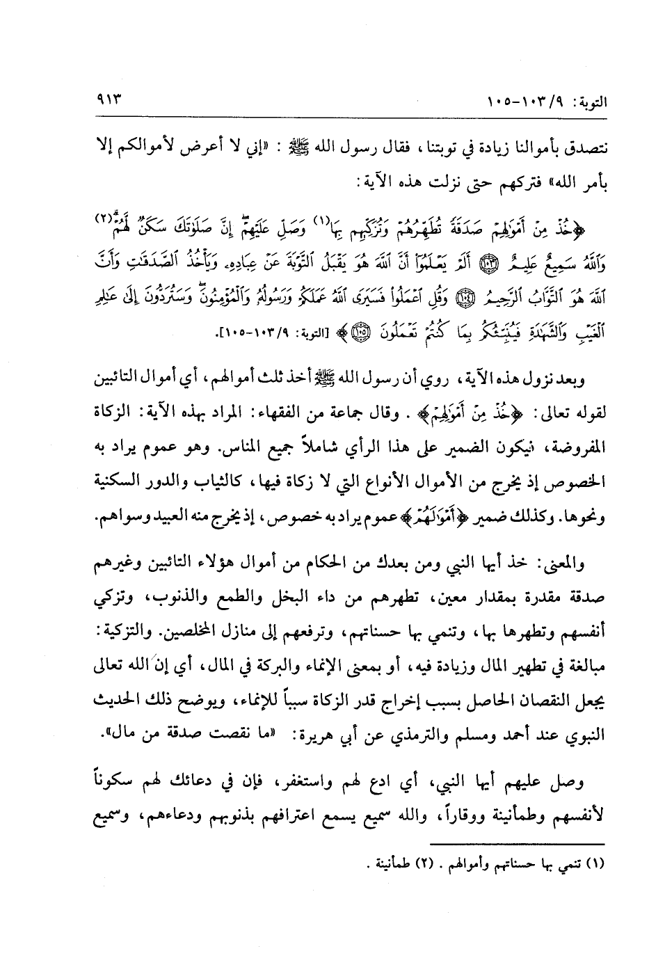 خُذْ مِنْ أَمْوالِهِمْ صَدَقَةً تُطَهِّرُهُمْ وَتُزَكِّيهِمْ بِها وَصَلِّ عَلَيْهِمْ إِنَّ صَلاتَكَ سَكَنٌ لَهُمْ وَاللَّهُ سَمِيعٌ عَلِيمٌ (103) أَلَمْ يَعْلَمُوا أَنَّ اللَّهَ هُوَ يَقْبَلُ التَّوْبَةَ عَنْ عِبادِهِ وَيَأْخُذُ الصَّدَقاتِ وَأَنَّ اللَّهَ هُوَ التَّوَّابُ الرَّحِيمُ (104) وَقُلِ اعْمَلُوا فَسَيَرَى اللَّهُ عَمَلَكُمْ وَرَسُولُهُ وَالْمُؤْمِنُونَ وَسَتُرَدُّونَ إِلى عالِمِ الْغَيْبِ وَالشَّهادَةِ فَيُنَبِّئُكُمْ بِما كُنْتُمْ تَعْمَلُونَ (105)