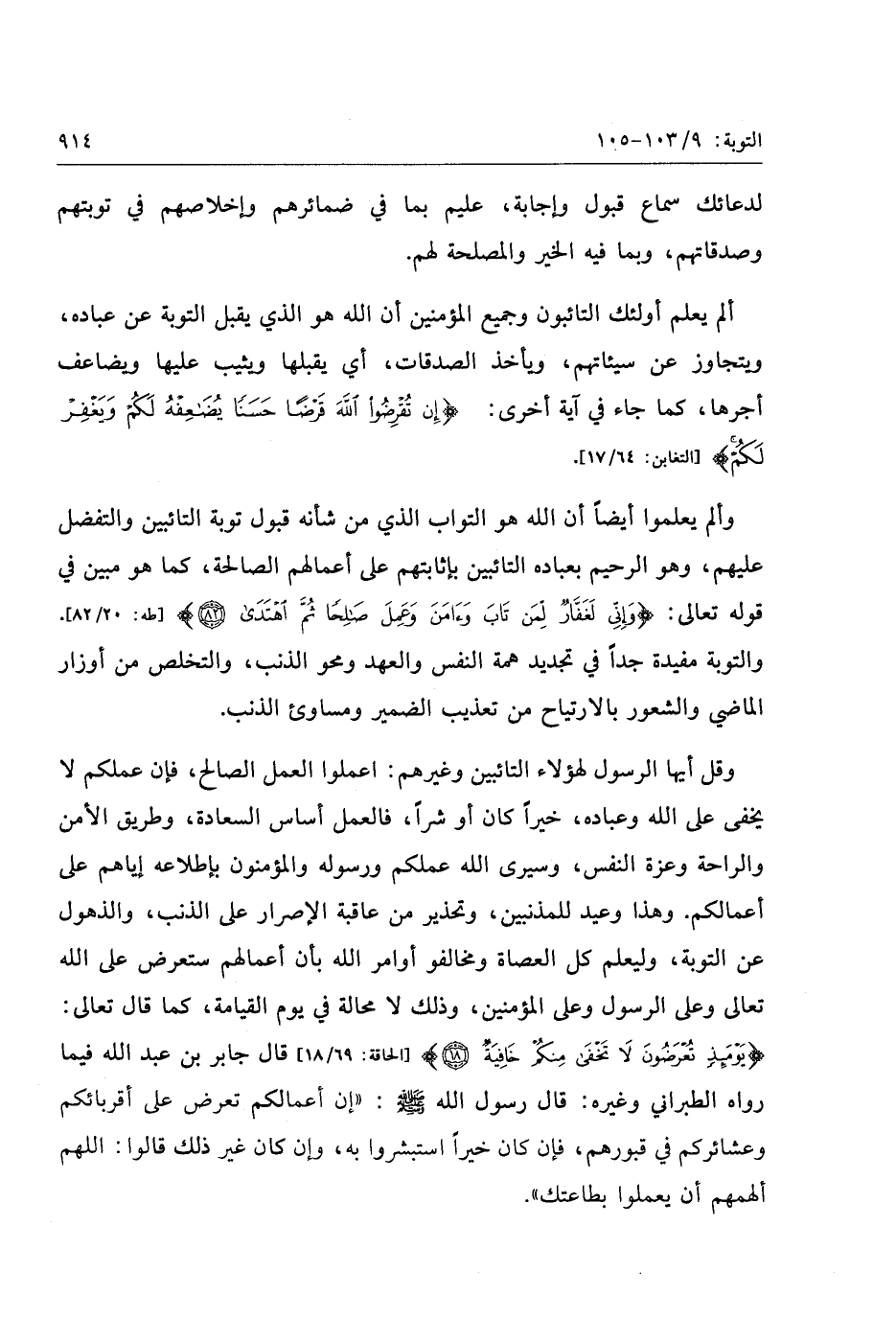 وقل أيها الرسول لهؤلاء التائبين وغيرهم: اعملوا العمل الصالح، فإن عملكم لا يخفى على الله وعباده، خيرا كان أو شرا، فالعمل أساس السعادة، وطريق الأمن والراحة وعزة النفس، وسيرى الله عملكم ورسوله والمؤمنون باطلاعه إياهم على أعمالكم. وهذا وعيد للمذنبين، وتحذير من عاقبة الإصرار على الذنب، والذهول عن التوبة، وليعلم كل العصاة ومخالفوا أوامر الله بأن أعمالهم ستعرض على الله تعالى وعلى الرسول وعلى المؤمنين، وذلك لا محالة في يوم القيامة، كما قال تعالى: