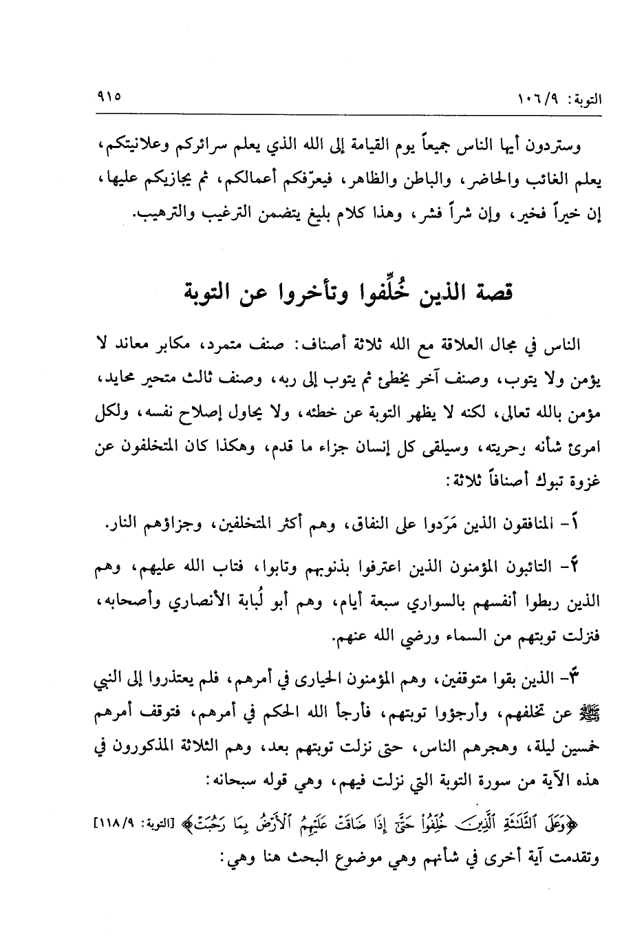الناس في مجال العلاقة مع الله ثلاثة أصناف: صنف متمرد، مكابر معاند لا يؤمن ولا يتوب، وصنف آخر يخطئ ثم يتوب إلى ربه، وصنف ثالث متحير محايد، مؤمن بالله تعالى، لكنه لا يظهر التوبة عن خطئه، ولا يحاول إصلاح نفسه، ولكل امرئ شأنه وحريته، وسيلقى كل إنسان جزاء ما قدم، وهكذا كان المتخلفون عن غزوة تبوك أصنافا ثلاثة: