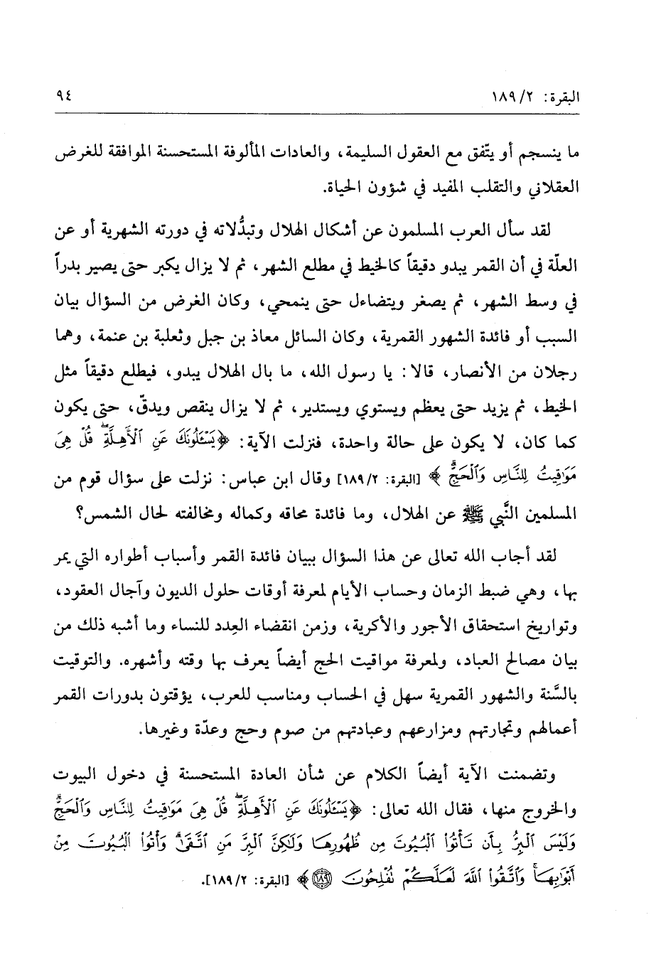 لقد أجاب الله تعالى عن هذا السؤال ببيان فائدة القمر وأسباب أطواره التي يمر بها، وهي ضبط الزمان وحساب الأيام لمعرفة أوقات حلول الديون وآجال العقود، وتواريخ استحقاق الأجور والأكرية، وزمن انقضاء العدد للنساء وما أشبه ذلك من بيان مصالح العباد، ولمعرفة مواقيت الحج أيضا يعرف بها وقته وأشهره. والتوقيت بالسّنة والشهور القمرية سهل في الحساب ومناسب للعرب، يؤقتون بدورات القمر أعمالهم وتجارتهم ومزارعهم وعبادتهم من صوم وحج وعدّة وغيرها.