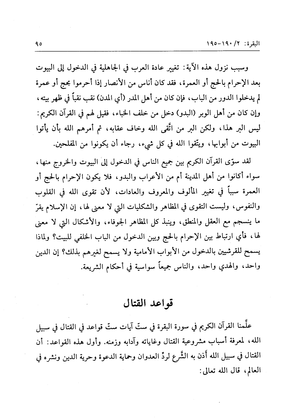 لقد سوّى القرآن الكريم بين جميع الناس في الدخول إلى البيوت والخروج منها، سواء أكانوا من أهل المدينة أم من الأعراب والبدو، فلا يكون الإحرام بالحج أو العمرة سببا في تغيير المألوف والمعروف والعادات، لأن تقوى الله في القلوب والنفوس، وليست التقوى في المظاهر والشكليات التي لا معنى لها، إن الإسلام يقرّ ما ينسجم مع العقل والمنطق، وينبذ كل المظاهر الجوفاء، والأشكال التي لا معنى لها، فأي ارتباط بين الإحرام بالحج وبين الدخول من الباب الخلفي للبيت؟ ولماذا يسمح للقرشيين بالدخول من الأبواب الإمامية ولا يسمح لغيرهم بذلك؟ إن الدين واحد، والهدي واحد، والناس جميعا سواسية في أحكام الشريعة.