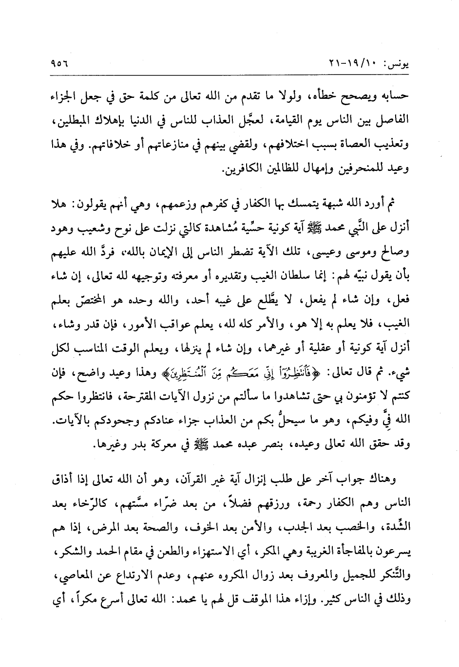 حسابه ويصحح خطأه، ولولا ما تقدم من الله تعالى من كلمة حق في جعل الجزاء الفاصل بين الناس يوم القيامة، لعجّل العذاب للناس في الدنيا بإهلاك المبطلين، وتعذيب العصاة بسبب اختلافهم، ولقضي بينهم في منازعاتهم أو خلافاتهم. وفي هذا وعيد للمنحرفين وإمهال للظالمين الكافرين.