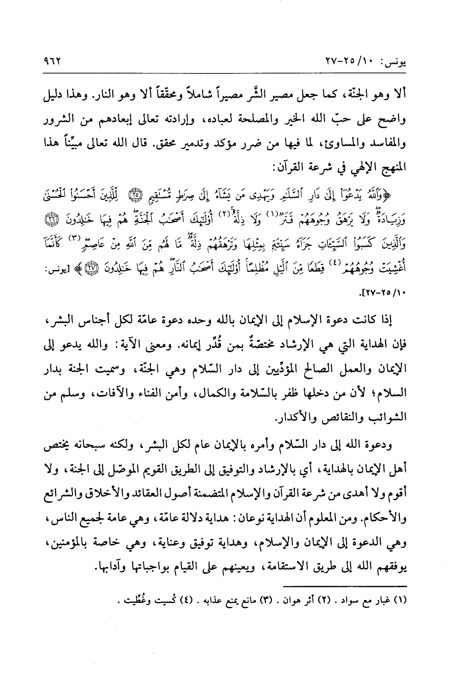 إذا كانت دعوة الإسلام إلى الإيمان بالله وحده دعوة عامّة لكل أجناس البشر، فإن الهداية التي هي الإرشاد مختصّة بمن قدّر إيمانه. ومعنى الآية: والله يدعو إلى الإيمان والعمل الصالح المؤدّيين إلى دار السّلام وهي الجنّة، وسميت الجنة بدار السلام، لأن من دخلها ظفر بالسّلامة والكمال، وأمن الفناء والآفات، وسلم من الشوائب والنقائص والأكدار.