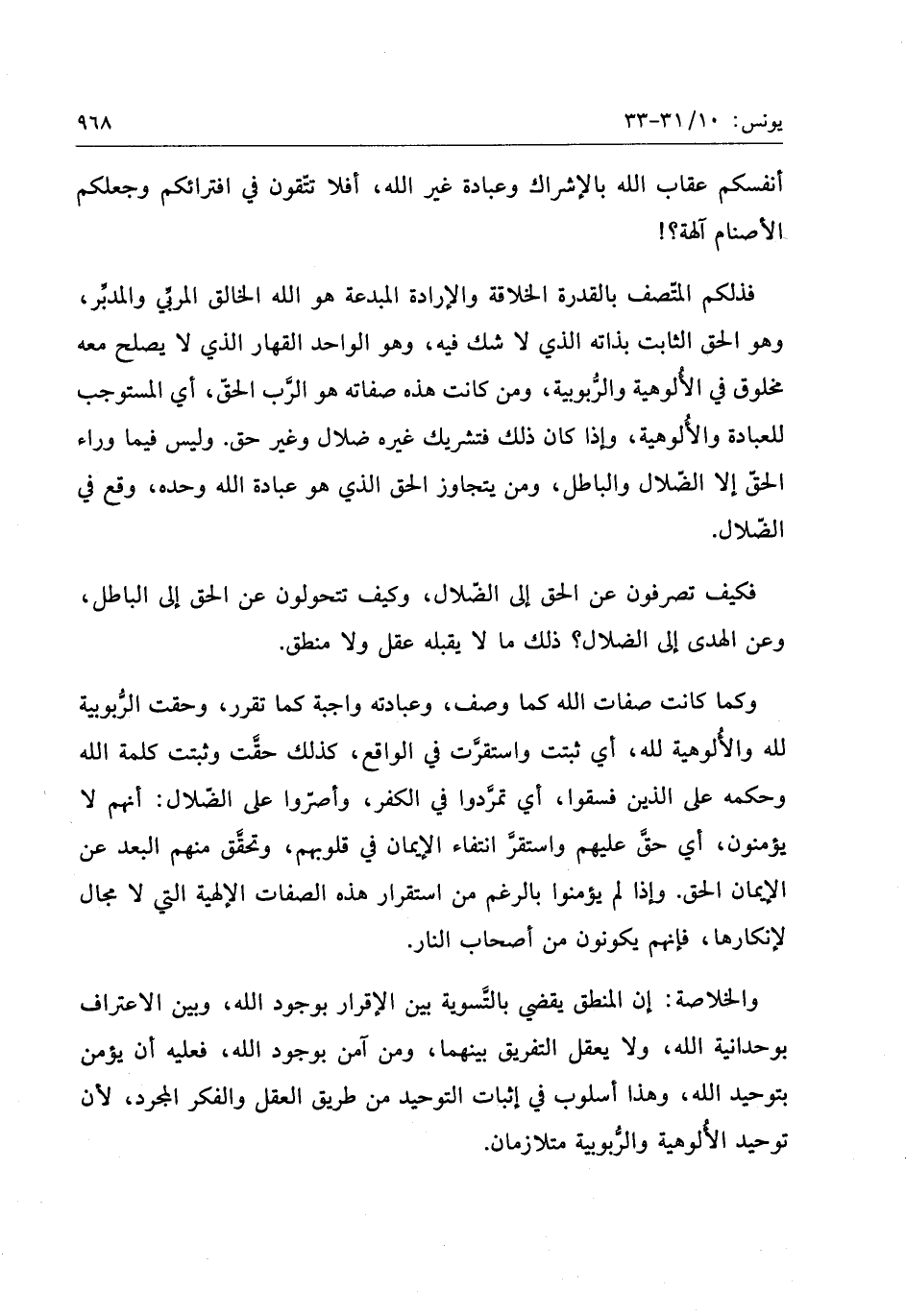 والخلاصة: إن المنطق يقضي بالتّسوية بين الإقرار بوجود الله، وبين الاعتراف بوحدانية الله، ولا يعقل التفريق بينهما، ومن آمن بوجود الله، فعليه أن يؤمن بتوحيد الله، وهذا أسلوب في إثبات التوحيد من طريق العقل والفكر المجرد، لأن توحيد الألوهية والرّبوبية متلازمان.