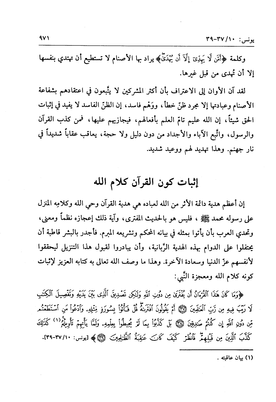 وَما كانَ هذَا الْقُرْآنُ أَنْ يُفْتَرى مِنْ دُونِ اللَّهِ وَلكِنْ تَصْدِيقَ الَّذِي بَيْنَ يَدَيْهِ وَتَفْصِيلَ الْكِتابِ لا رَيْبَ فِيهِ مِنْ رَبِّ الْعالَمِينَ (37) أَمْ يَقُولُونَ افْتَراهُ قُلْ فَأْتُوا بِسُورَةٍ مِثْلِهِ وَادْعُوا مَنِ اسْتَطَعْتُمْ مِنْ دُونِ اللَّهِ إِنْ كُنْتُمْ صادِقِينَ (38) بَلْ كَذَّبُوا بِما لَمْ يُحِيطُوا بِعِلْمِهِ وَلَمَّا يَأْتِهِمْ تَأْوِيلُهُ كَذلِكَ كَذَّبَ الَّذِينَ مِنْ قَبْلِهِمْ فَانْظُرْ كَيْفَ كانَ عاقِبَةُ الظَّالِمِينَ (39)