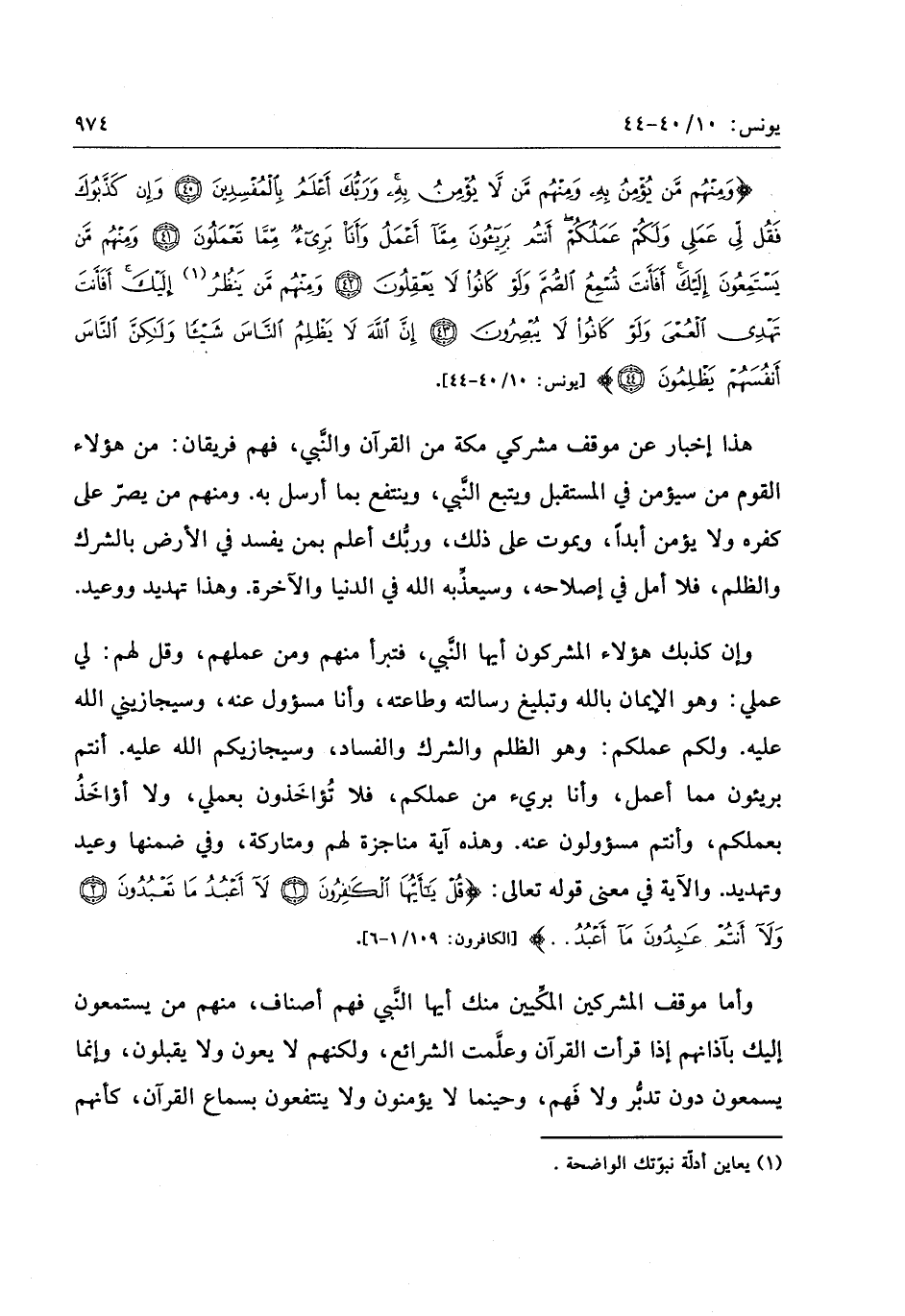 وَمِنْهُمْ مَنْ يُؤْمِنُ بِهِ وَمِنْهُمْ مَنْ لا يُؤْمِنُ بِهِ وَرَبُّكَ أَعْلَمُ بِالْمُفْسِدِينَ (40) وَإِنْ كَذَّبُوكَ فَقُلْ لِي عَمَلِي وَلَكُمْ عَمَلُكُمْ أَنْتُمْ بَرِيئُونَ مِمَّا أَعْمَلُ وَأَنَا بَرِيءٌ مِمَّا تَعْمَلُونَ (41) وَمِنْهُمْ مَنْ يَسْتَمِعُونَ إِلَيْكَ أَفَأَنْتَ تُسْمِعُ الصُّمَّ وَلَوْ كانُوا لا يَعْقِلُونَ (42) وَمِنْهُمْ مَنْ يَنْظُرُ إِلَيْكَ أَفَأَنْتَ تَهْدِي الْعُمْيَ وَلَوْ كانُوا لا يُبْصِرُونَ (43) إِنَّ اللَّهَ لا يَظْلِمُ النَّاسَ شَيْئاً وَلكِنَّ النَّاسَ أَنْفُسَهُمْ يَظْلِمُونَ (44)