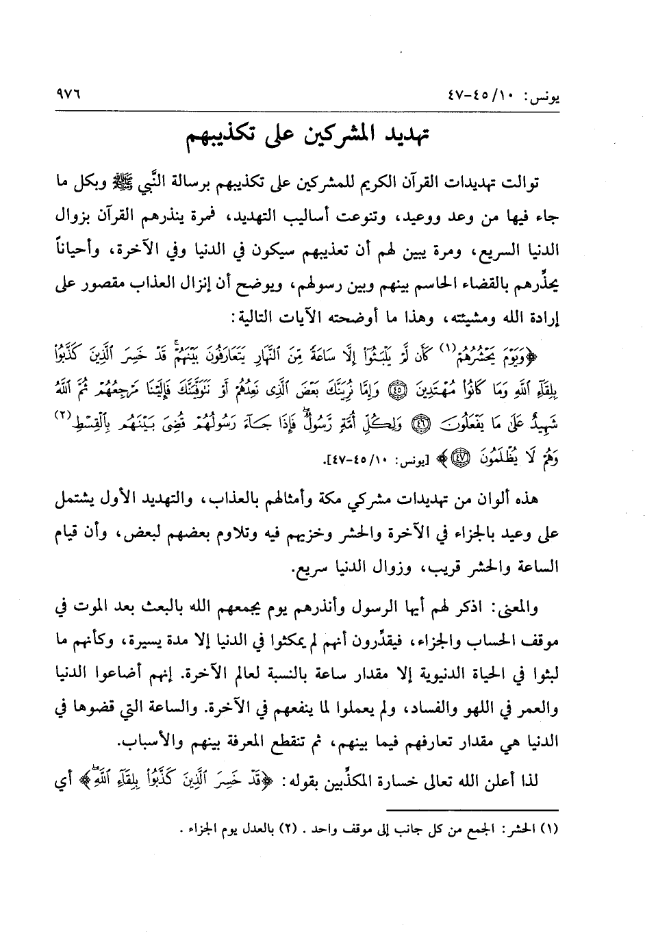 وَيَوْمَ يَحْشُرُهُمْ كَأَنْ لَمْ يَلْبَثُوا إِلاَّ ساعَةً مِنَ النَّهارِ يَتَعارَفُونَ بَيْنَهُمْ قَدْ خَسِرَ الَّذِينَ كَذَّبُوا بِلِقاءِ اللَّهِ وَما كانُوا مُهْتَدِينَ (45) وَإِمَّا نُرِيَنَّكَ بَعْضَ الَّذِي نَعِدُهُمْ أَوْ نَتَوَفَّيَنَّكَ فَإِلَيْنا مَرْجِعُهُمْ ثُمَّ اللَّهُ شَهِيدٌ عَلى ما يَفْعَلُونَ (46) وَلِكُلِّ أُمَّةٍ رَسُولٌ فَإِذا جاءَ رَسُولُهُمْ قُضِيَ بَيْنَهُمْ بِالْقِسْطِ وَهُمْ لا يُظْلَمُونَ (47)