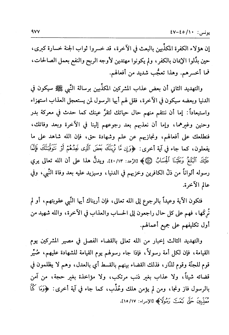 والتهديد الثاني أن بعض عذاب المشركين المكذّبين برسالة النّبي صلّى الله عليه وسلّم سيكون في الدنيا وبعضه سيكون في الآخرة، فقل لهم أيها الرسول لمن يستعجل العذاب استهزاء واستبعادا: إما أن ننتقم منهم حال حياتك لتقرّ عينك كما حدث في معركة بدر وحنين وغيرهما، وإما أن نعذبهم بعد رجوعهم إلينا في الآخرة وبعد وفاتك، فنطلعك على أفعالهم، ونجازيهم عن علم وشهادة حق، فإن الله شاهد على ما يفعلون، كما جاء في آية أخرى: وَإِنْ ما نُرِيَنَّكَ بَعْضَ الَّذِي نَعِدُهُمْ أَوْ نَتَوَفَّيَنَّكَ فَإِنَّما عَلَيْكَ الْبَلاغُ وَعَلَيْنَا الْحِسابُ (40) [الرّعد: 13/ 40] . ويدلّ هذا على أن الله تعالى يري رسوله ألوانا من ذلّ الكافرين وخزيهم في الدنيا، وسيزيد عليه بعد وفاة النّبي، وفي عالم الآخرة.