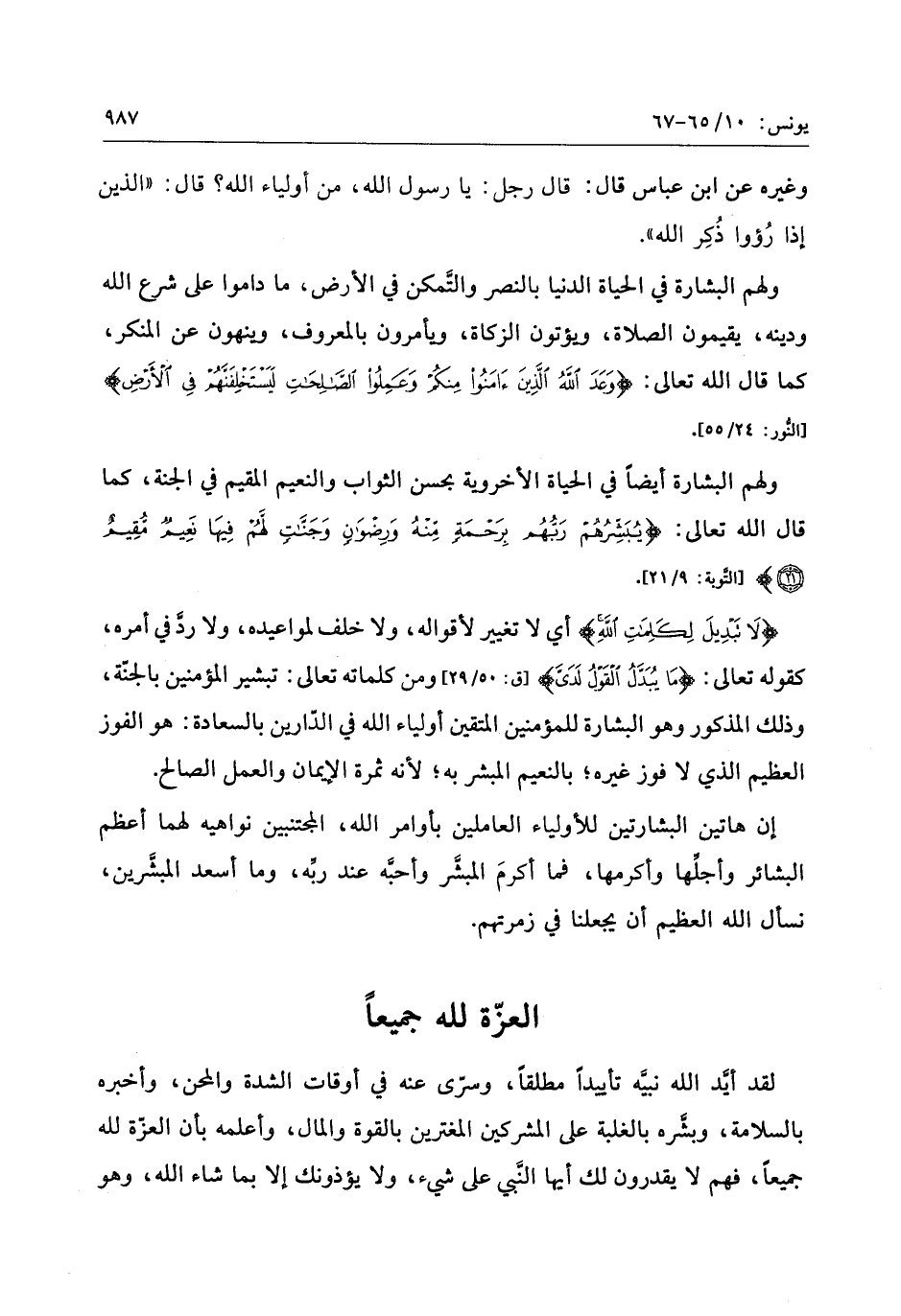 إن هاتين البشارتين للأولياء العاملين بأوامر الله، المجتنبين نواهيه لهما أعظم البشائر وأجلّها وأكرمها، فما أكرم المبشّر وأحبّه عند ربّه، وما أسعد المبشّرين، نسأل الله العظيم أن يجعلنا في زمرتهم.