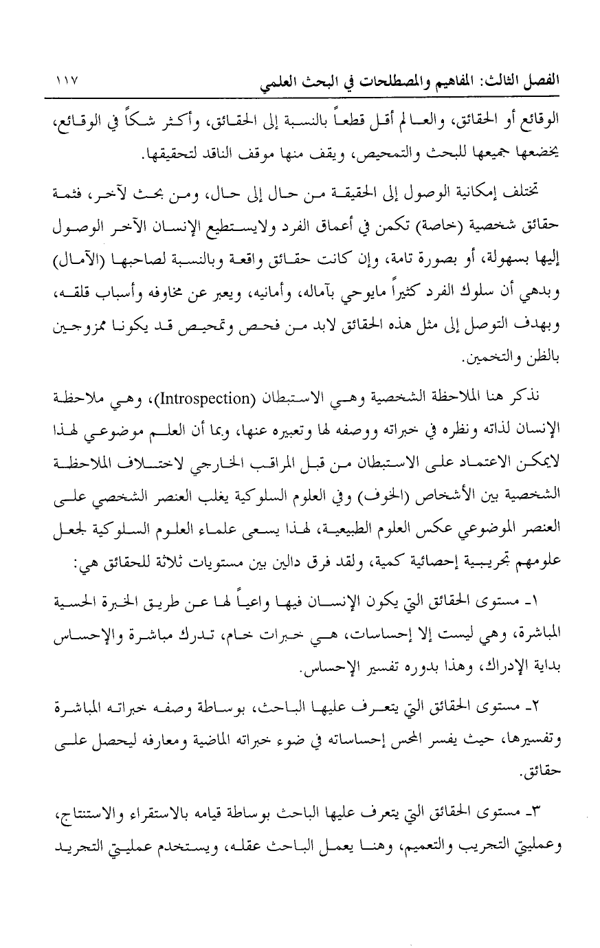 نذكر هنا الملاحظة الشخصية وهي الاستبطان "Introspection"، وهي ملاحظة الإنسان لذاته ونظره في خبراته ووصفه لها وتعبيره عنها، وبما أن العلم موضوعي لهذا لا يمكن الاعتماد على الاستبطان من قبل المراقب الخارجي لاختلاف الملاحظة الشخصية بين الأشخاص "الخوف" وفي العلوم السلوكية يغلب العنصر الشخصي على العنصر الموضوعي عكس العلوم الطبيعية، لهذا يسعى علماء العلوم السلوكية لجعل علومهم تجريبية إحصائية كمية، ولقد فرق دالين بين مستويات ثلاثة للحقائق هي: