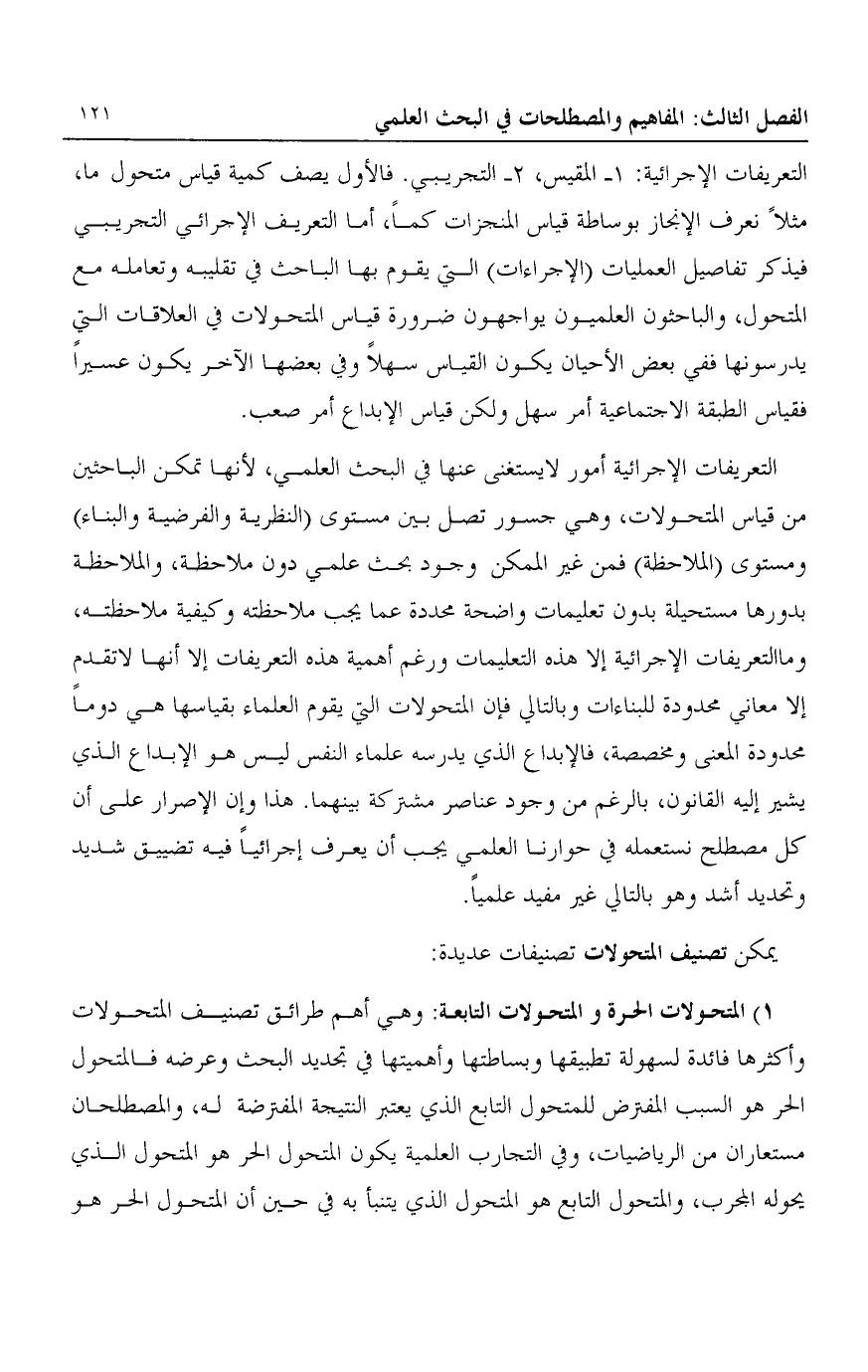 التعريفات الإجرائية أمور لا يستغنى عنها في البحث العلمي، لأنها تمكن الباحثين من قياس المتحولات، وهي جسور تصل بين مستوى "النظرية والفرضية والبناء" ومستوى "الملاحظة" فمن غير الممكن وجود بحث علمي دون ملاحظة، والملاحظة بدورها مستحيلة بدون تعليمات واضحة محددة عما يجب ملاحظته وكيفية ملاحظته، وما التعريفات الإجرائية إلا هذه التعليمات ورغم أهمية هذه التعريفات إلا أنها لا تقدم إلا معاني محدودة للبناءات وبالتالي فإن المتحولات التي يقوم العلماء بقياسها هي دوما محدودة المعنى ومخصصة، فالإبداع الذي يدرسه علماء النفس ليس هو الإبداع الذي يشير إليه القانون، بالرغم من وجود عناصر مشتركة بينهما. هذا وإن الإصرار على أن كل مصطلح نستعمله في حوارنا العلمي يجب أن يعرف إجرائيا فيه تضييق شديد وتحديد أشد وهو بالتالي غير مفيد علميا.