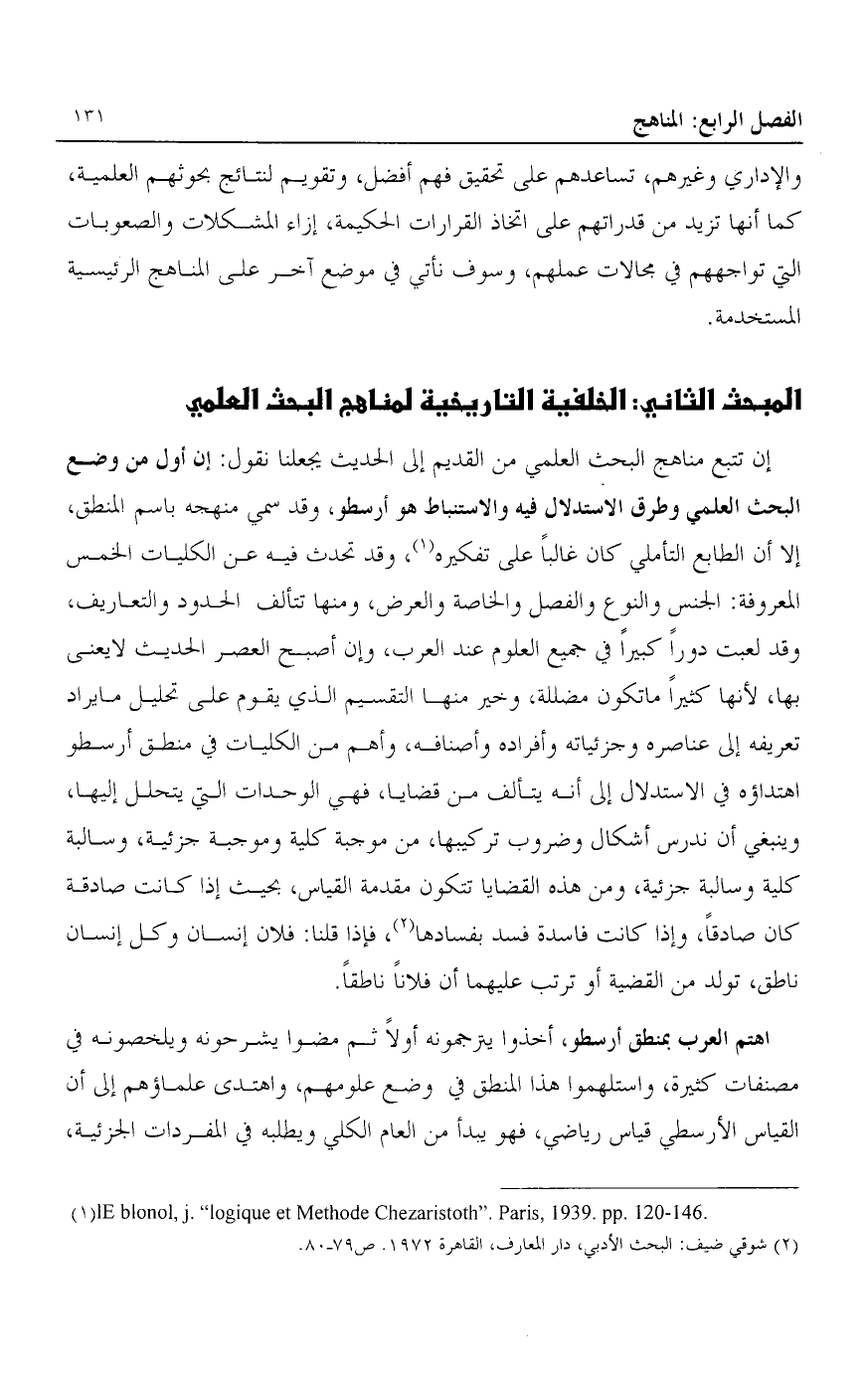 إن تتبع مناهج البحث العلمي من القديم إلى الحديث يجعلنا نقول: إن أول من وضع البحث العلمي وطرق الاستدلال فيه والاستنباط هو أرسطو، وقد سمى منهجه باسم المنطق، إلا أن الطابع التأملي كان غالبا على تفكيره1، وقد تحدث فيه عن الكليات الخمس المعروفة: الجنس والنوع والفصل والخاصة والعرض، ومنها تتألف الحدود والتعاريف، وقد لعبت دورا كبيرا في جميع العلوم عند العرب، وإن أصبح العصر الحديث لا يعنى بها، لأنها كثيرا ما تكون مضللة، وخير منها التقسيم الذي يقوم على تحليل ما يراد تعريفه إلى عناصره وجزئياته وأفراده وأصنافه، وأهم من الكليات في منطق أرسطو اهتداؤه في الاستدلال إلى أنه يتألف من قضايا، فهي الوحدات التي يتخلل إليها، وينبغي أن ندرس أشكال وضروب تركيبها، من موجبة كلية وموجبة جزئية، وسالبة كلية وسالبة جزئية، ومن هذه القضايا تتكون مقدمة القياس، بحيث إذا كانت صادقة كان صادقا، وإذا كانت فاسدة فسد بفسادها2، فإذا قلنا: فلان إنسان وكل إنسان ناطق، تولد من القضية أو ترتب عليهما أن فلانا ناطقا.