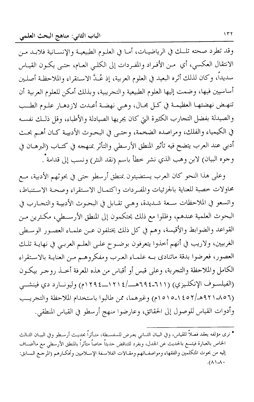 وقد تطرد صحته تلك في الرياضيات، أما في العلوم الطبيعية والإنسانية فلا بد من الانتقال العكسي، أي من الأفراد والمفردات إلى الكلي العام، حتى يكون القياس سديدا، وكان لذلك أثره البعيد في العلوم العربية، إذ عد الاستقراء والملاحظة أصلين أساسيين فيها، وضمت إليها العلوم الطبيعية والتجريبية، وبذلك أمكن للعلوم العربية أن تنهض نهضتها العظيمة في كل مجال، وهي نهضة أعدت لازدهار علوم الطب والصيدلة بفضل التجارب الكثيرة التي كان يجريها الصيادلة والأطباء، وقل ذلك نفسه في الكيمياء والفلك، ومراصده الضخمة، وحتى في البحوث الأدبية كان أهم بحث أدبي عند العرب يتضح فيه تأثير المنطق الأرسطي والتأثر بمنهجه في كتاب "البرهان في وجوه البيان" لابن وهب الذي نشر خطأ باسم "نقد النثر" ونسب إلى قدامة1.
