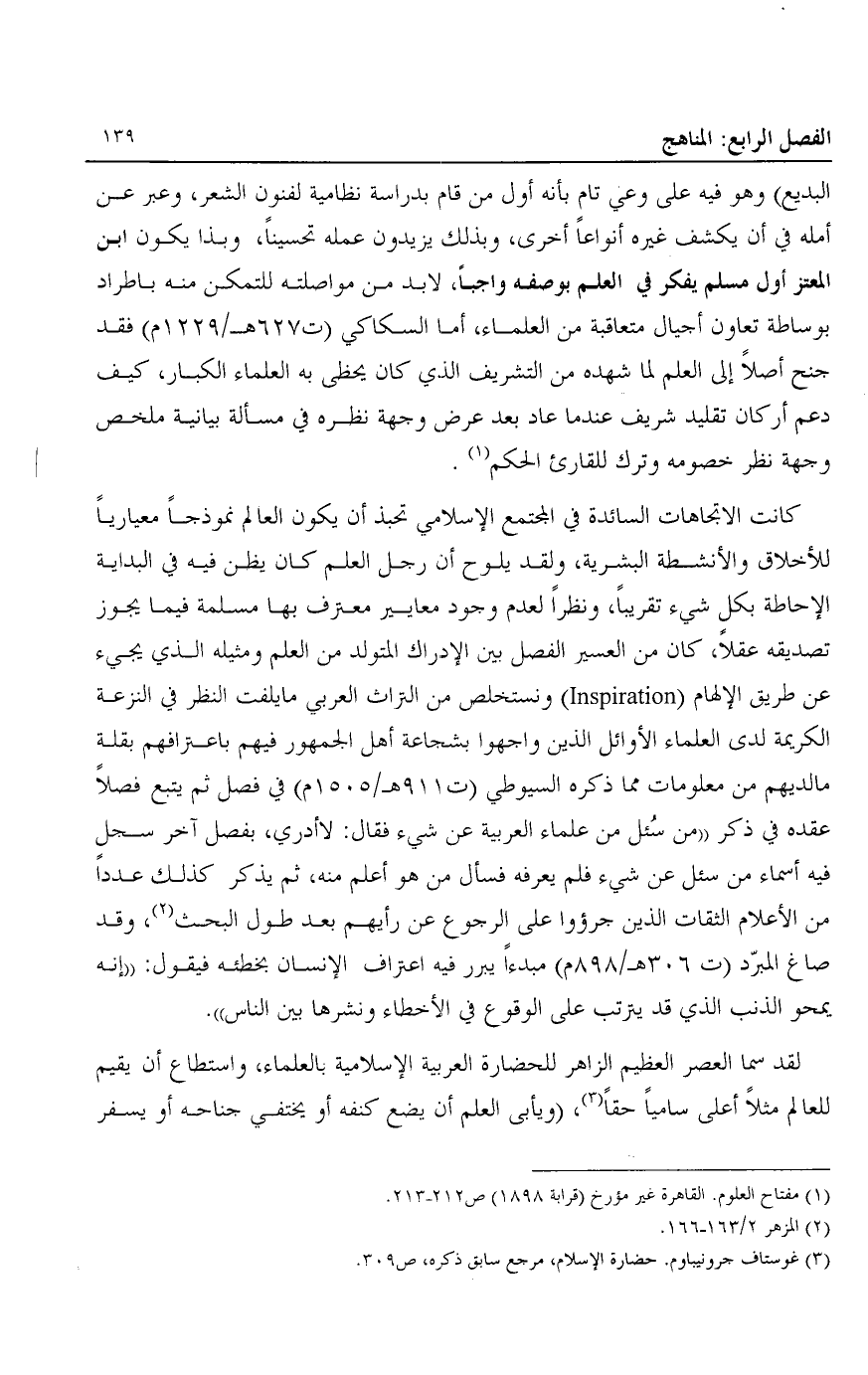 البديع" وهو فيه على وعي تام بأنه أول من قام بدراسة نظامية لفنون الشعر، وعبر عن أمله في أن يكشف غيره أنواعا أخرى، وبذلك يزيدون عمله تحسينا، وبذا يكون ابن المعتز أول مسلم يفكر في العلم بوصفه واجبا، لا بد من مواصلته للتمكن منه باطراد بوساطة تعاون أجيال متعاقبة من العلماء، أما السكاكي "ت 627هـ/ 1229م" فقد جنح أصلا إلى العلم لما شهده من التشريف الذي كان يحظى به العلماء الكبار، كيف دعم أركان تقليد شريف عندما عاد بعد عرض وجهة نظره في مسألة بيانية ملخص وجهة نظر خصومه وترك للقارئ الحكم1.