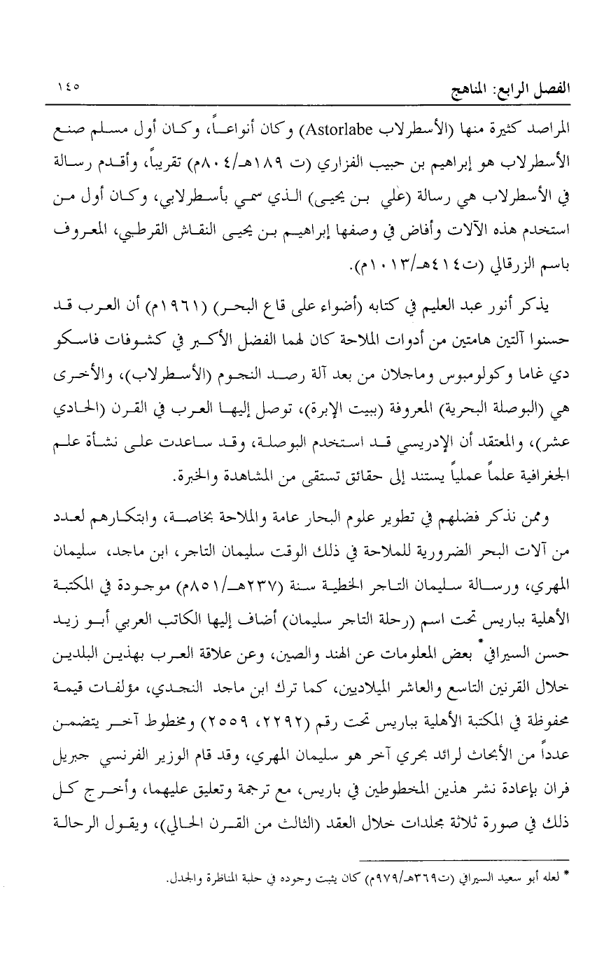 وممن نذكر فضلهم في تطوير علوم البحار عامة والملاحة بخاصة، وابتكارهم لعدد من آلات البحر الضرورية للملاحة في ذلك الوقت سليمان التاجر، ابن ماجد، سليمان المهري، ورسالة سليمان التاجر الخطية سنة "237هـ/ 851م" موجودة في المكتبة الأهلية بباريس تحت اسم "رحلة التاجر سليمان" أضاف إليها الكاتب العربي أبو زيد حسن السيرافي1 بعض المعلومات عن الهند والصين، وعن علاقة العرب بهذين البلدين خلال القرنين التاسع والعاشر الميلاديين، كما ترك ابن ماجد النجدي، مؤلفات قيمة محفوظة في المكتبة الأهلية بباريس تحت رقم "2292، 2559" ومخطوط آخر يتضمن عددا من الأبحاث لرائد بحري آخر هو سليمان المهري، وقد قام الوزير الفرنسي جبريل فران بإعادة نشر هذين المخطوطين في باريس، مع ترجمة وتعليق عليهما، وأخرج كل ذلك في صورة ثلاثة مجلدات خلال العقد "الثالث من القرن الحالي"، ويقول الرحالة