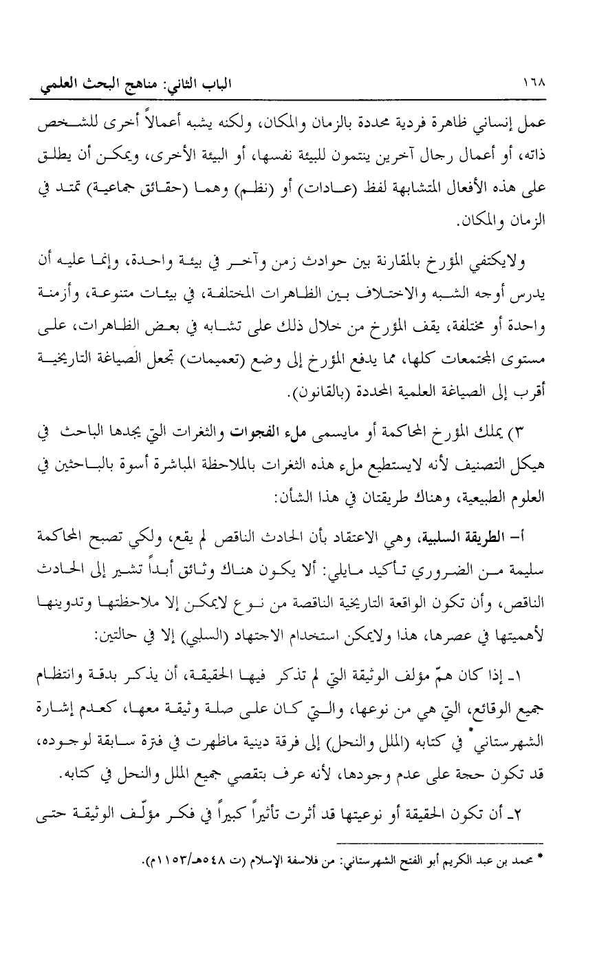 1- إذا كان هم مؤلف الوثيقة التي لم تذكر فيها الحقيقة، أن يذكر بدقة وانتظام جميع الوقائع، التي هي من نوعها، والتي كان على صلة وثيقة معها، كعدم إشارة الشهر ستاني1 في كتابه "الملل والنحل" إلى فرقة دينية ما ظهرت في فترة سابقة لوجوده، قد تكون حجة على عدم وجودها، لأنه عرف بتقصي جميع الملل والنحل في كتابه.