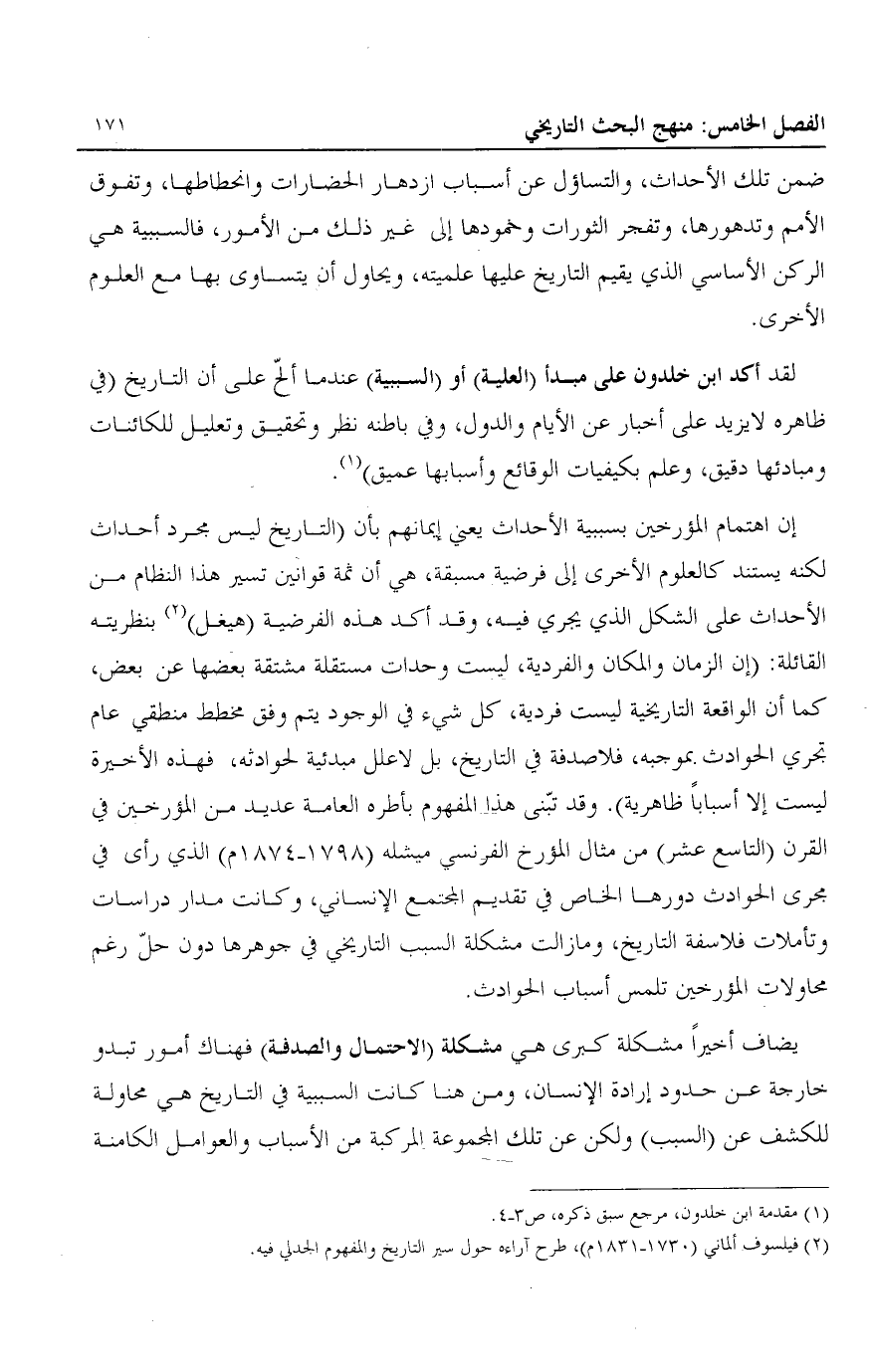 ضمن تلك الأحداث، والتساؤل عن أسباب ازدهار الحضارات وانحطاطها، وتفوق الأمم وتدهورها، وتفجر الثورات وخمودها إلى غير ذلك من الأمور، فالسببية هي الركن الأساسي الذي يقيم التاريخ عليها علميتهن ويحاول أن يتساوى بها مع العلوم الأخرى.