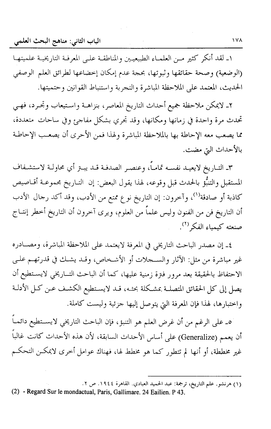 1- لقد أنكر كثير من العلماء الطبيعيين والمناطقة على المعرفة التاريخية علميتها "الوضعية" وصحة حقائقها وثبوتها، بحجة عدم إمكان إخضاعها لطرائق العلم الوصفي الحديث، المعتمد على الملاحظة المباشرة والتجربة واستنباط القوانين وحتميتها.