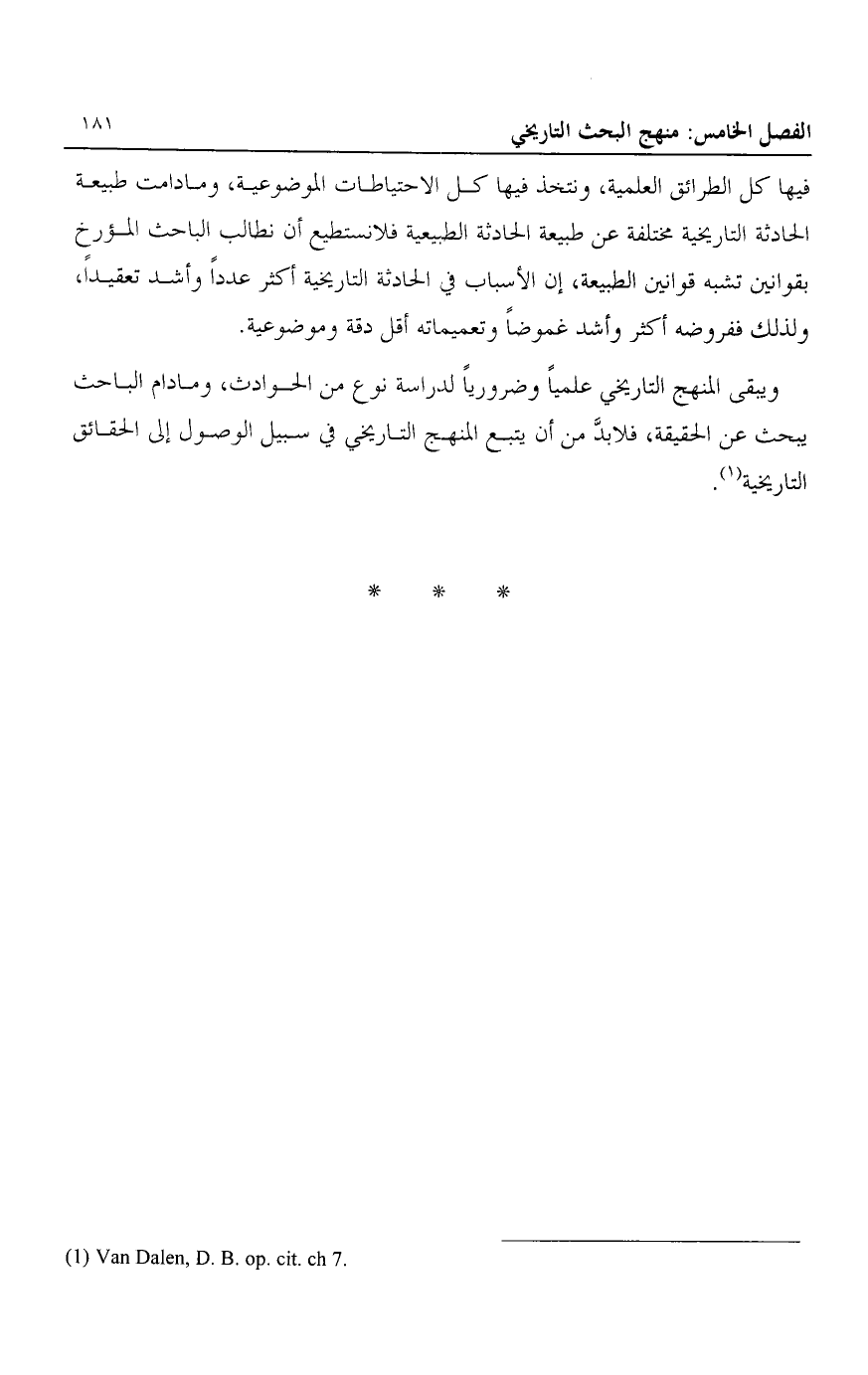 فيها كل الطرائق العلمية، ونتخذ فيها كل الاحتياطات الموضوعية، وما دامت طبيعة الحادثة التاريخية مختلفة عن طبيعة الحادثة الطبيعية فلا نستطيع أن نطالب الباحث المؤرخ بقوانين تشبه قونين الطبيعة، إن الأسباب في الحادثة التاريخية أكثر عددا وأشد تعقيدا، ولذلك ففروضه أكثر وأشد غموضا وتعميماته أقل دقة وموضوعية.