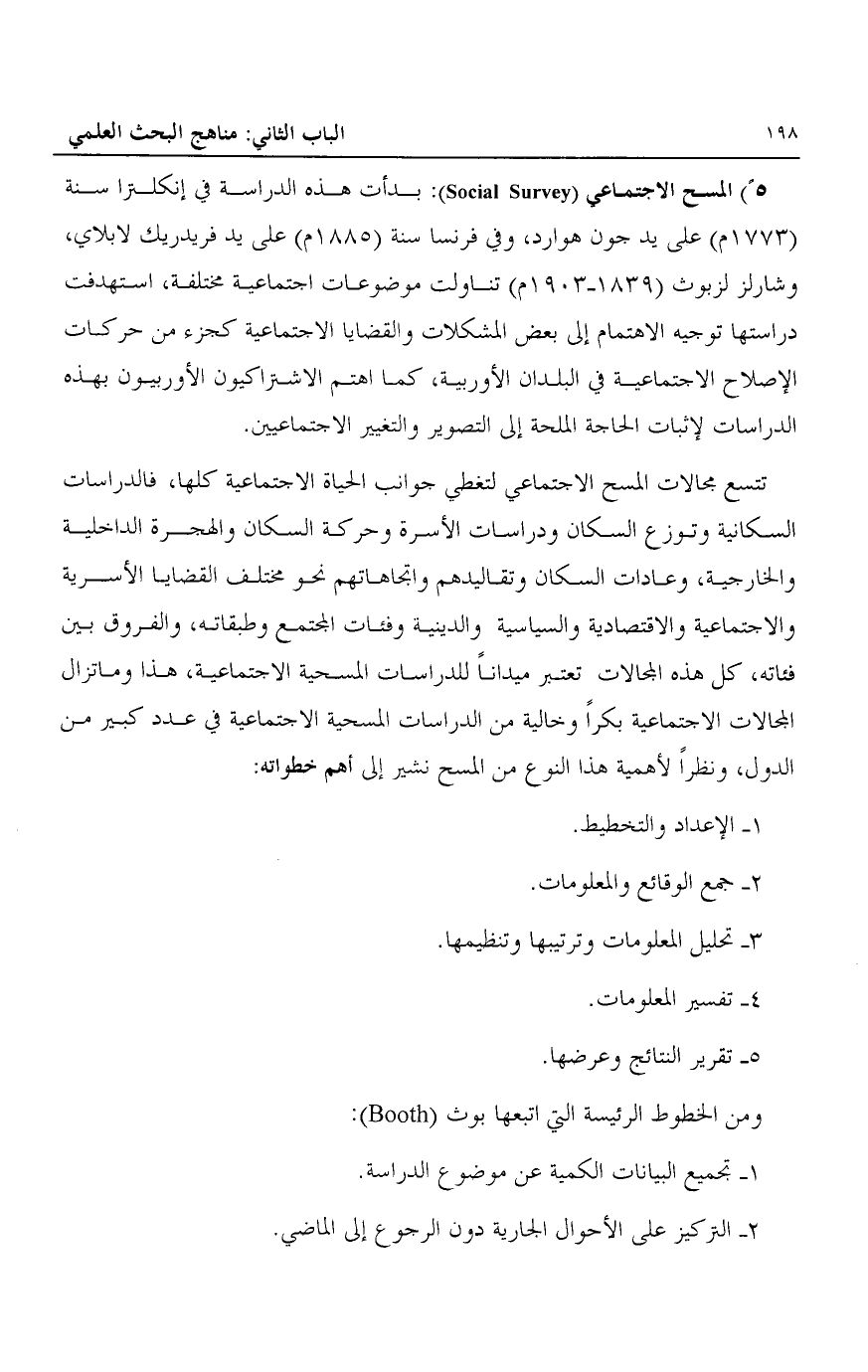 5- المسح الاجتماعي "Social Survey": بدأت هذه الدراسة في إنكلترا سنة "1773م" على يد جون هوارد، وفي فرنسا سنة 1885م" على يد فريدريك لابلاي، وشارلز لزبوث "1839-1903م" تناولت موضوعات اجتماعية مختلفة، استهدفت دراستها توجيه الاهتمام إلى بعض المشكلات والقضايا الاجتماعية كجزء من حركات الإصلاح الاجتماعية في البلدان الأوروبية، كما اهتم الاشتراكيون الأوربيون بهذه الدراسات لإثبات الحاجة الملحة إلى التصوير والتغيير الاجتماعيين.