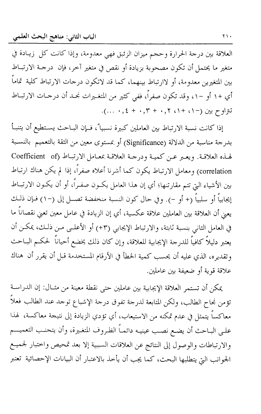 إذا كانت نسبة الارتباط بين العاملين كبيرة نسبيا، فإن الباحث يستطيع أن يتنبأ بدرجة مناسبة من الدلالة "Significance" أو بمستوى معين من الثقة بالتعميم بالنسبة لهذه العلاقة. ويعبر عن كمية ودرجة العلاقة بمعامل الارتباط "Cofficient of Correlation" ومعامل الارتباط يكون كما أشرنا أعلاه صفرا، أو أن يكون الارتباط إيجابيا أو سلبيا "+ أو -". وفي حال كون النسبة منخفضة تصل إلى "-1" فإن ذلك يعني أن العلاقة بين العاملين علاقة عكسية، أي إن الزيادة في عامل معين تعني نقصانا ما في العامل الثاني بنسبة ثابتة، والارتباط الإيجابي "3+" أو الأعلى من ذلك، يمكن أن يعتبر دليلا كافيا للدرجة الإيجابية للعلاقة وإن كان ذلك يخضع أحيانا لحكم الباحث وتقديره، الذي عليه أن يحسب كمية الخطأ في الأرقام المستخدمة قبل أن يقرر أن هناك علاقة قوية أو ضعيفة بين عاملين.