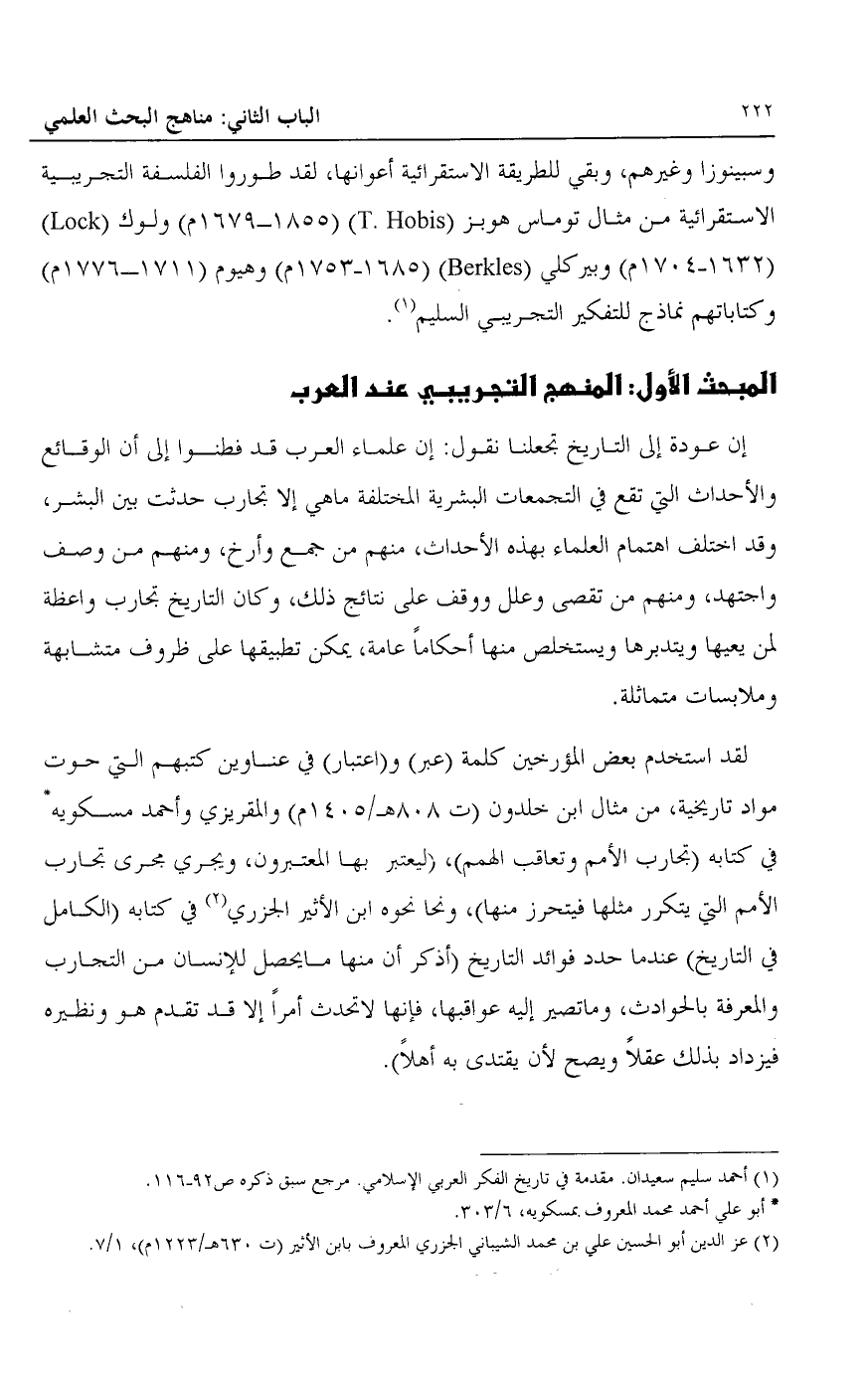 في كتابه "تجارب الأمم وتعاقب الهمم"، "ليعتبر بها المعتبرون، ويجري مجرى تجارب الأمم التي يتكرر مثلها فيتحرز منها"، ونحا نحوه ابن الأثير الجزري2 في كتابه "الكامل في التاريخ" عندما حدد فوائد التاريخ "أذكر أن منها ما يحصل للإنسان من التجارب والمعرفة بالحوادث، وما تصير إليه عواقبها، فإنها لا تحدث أمرا إلا قد تقدم هو ونظيره فيزداد بذلك عقلا ويصح لأن يقتدى به أهلا".