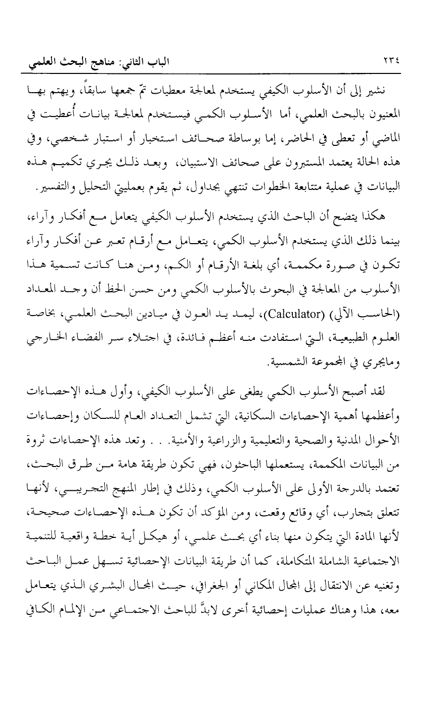 هكذا يتضح أن الباحث الذي يستخدم الأسلوب الكيفي يتعامل مع أفكار وآراء، بينما ذلك الذي يستخدم الأسلوب الكمي، يتعامل مع أرقام تعبر عن أفكار وآراء تكون في صورة مكممة، أي بلغة الأرقام أو الكم، ومن هنا كانت تسمية هذا الأسلوب من المعالجة في البحوث بالأسلوب الكمي ومن حسن الحظ أن وجد المعداد "الحاسب الآلي" "Calculator"، ليمد يد العون في ميادين البحث العلمي، بخاصة العلوم الطبيعية، التي استفادت منه أعظم فائدة، في اجتلاء سر الفضاء الخارجي وما يجري في المجموعة الشمسية.