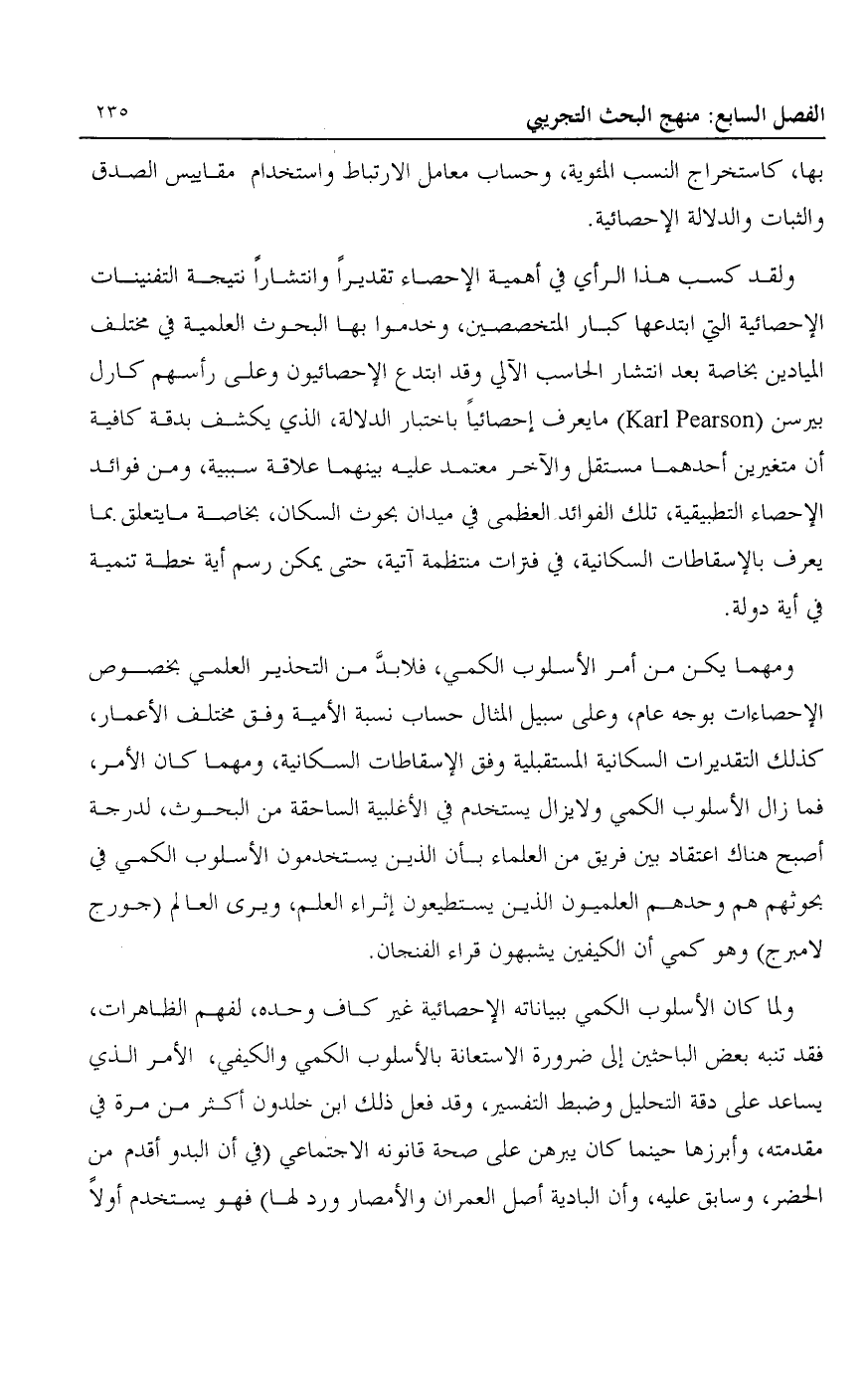 ولقد كسب هذا الرأي في أهمية الإحصاء تقديرا وانتشارا نتيجة التفنينات الإحصائية التي ابتدعها كبار المتخصصين، وخدموا بها البحوث العلمية في مختلف الميادين بخاصة بعد انتشار الحاسب الآلي وقد ابتدع الإحصائيون وعلى رأسهم كارل بيرسن "Karl Pearson" ما يعرف إحصائيا باختبار الدلالة، الذي يكشف بدقة كافية أن متغيرين أحدهما مستقل والآخر معتمد عليه بينهما علاقة سببي، ومن فوائد الإحصاء التطبيقية، تلك الفوائد العظمى في ميدان بحوث السكان، بخاصة ما يتعلق بما يعرف بالإسقاطات السكانية، في فترات منتظمة آتية، حتى يمكن رسم أية خطة تنمية في أية دولة.