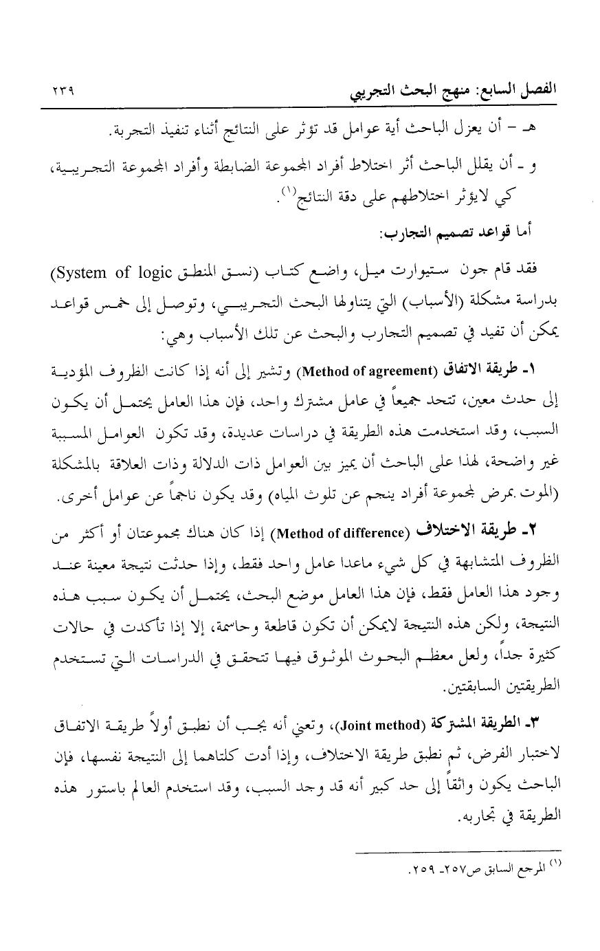 2- طريقة الاختلاف "Method of Difference" إذا كان هناك مجموعتان أو أكثر من الظروف المتشابهة في كل شيء ما عدا عامل واحد فقط، وإذا حدثت نتيجة معينة عند وجود هذا العامل فقط، فإن هذا العامل موضع البحث، يحتمل أن يكون سبب هذه النتيجة، ولكن هذه النتيجة لا يمكن أن تكون قاطعة وحاسمة، إلا إذا تأكدت في حالات كثيرة جدا، ولعل معظم البحوث الموثوق فيها تتحقق في الدراسات التي تستخدم الطريقتين السابقتين.