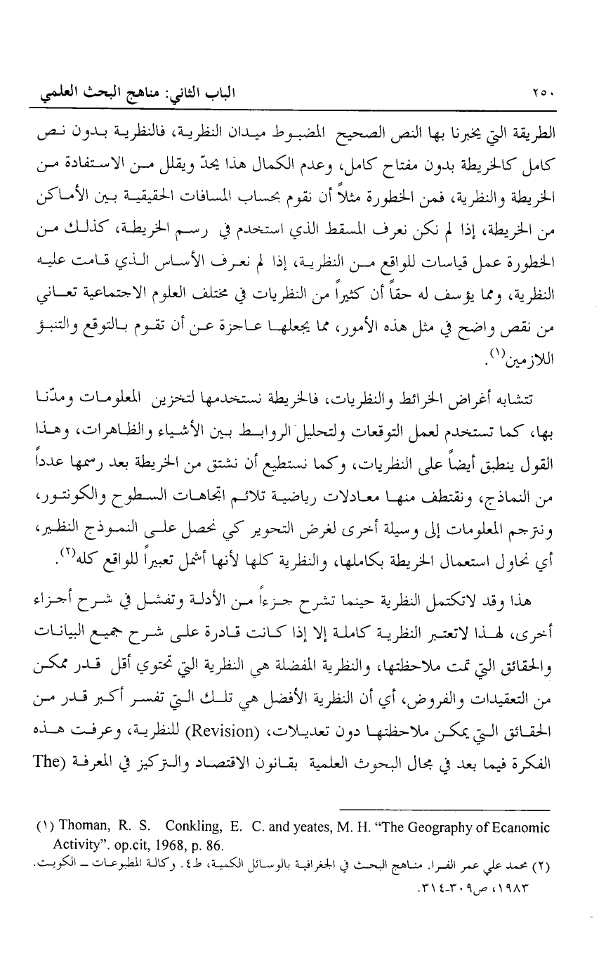 الطريقة التي يخبرنا بها النص الصحيح المضبوط ميدان النظرية، فالنظرية بدون نص كامل كالخريطة بدون مفتاح كامل، وعدم الكمال هذا يحد ويقلل من الاستفادة من الخريطة والنظرية، فمن الخطورة مثلا أن نقوم بحساب المسافات الحقيقية بين الأماكن من الخريطة، إذا لم نكن نعرف المسقط الذي استخدم في رسم الخريطة، كذلك من الخطورة عمل قياسات للواقع من النظرية، إذا لم نعرف الأساس الذي قامت عليه النظرية، ومما يؤسف له حقا أن كثيرا من النظريات في مختلف العلوم الاجتماعية تعاني من نقص واضح في مثل هذه الأمور، مما يجعلها عاجزة عن أن تقوم بالتوقع والتنبؤ اللازمين1.