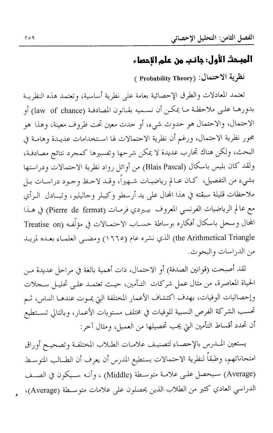 تعتمد المعادلات والطرق الإحصائية بعامة على نظرية أساسية، وتعتمد هذه النظرية بدورها على ملاحظة ما يمكن أن نسميه بقانون المصادفة "Law of chance" أو الاحتمال، والاحتمال هو حدوث شيء، أو حدث معين تحت ظروف معينة، وهذا هو محور نظرية الاحتمال، ورغم أن نظرية الاحتمالات لها استخدامات عديدة وهامة في البحث، ولكن هناك تجارب عديدة لا يمكن شرحها وتفسيرها كمجرد نتائج مصادفة، ولقد كان بليس باسكال "Blais Bascal" من أوائل رواد نظرية الاحتمالات ودراستها بشيء من التفصيل، كان عالم رياضيات شهيرا، وقد لاحظ وجود دراسات بل ملاحظات قليلة سبقته في هذا المجال على يد أرسطو وكيبلر وجاليليو، وتبادل الرأي مع عالم الرياضيات الفرنسي المعروف بييردي فرمات "Pierre d fermat" في هذا المجال وسجل باسكال أفكاره بوساطة حساب الاحتمالات في مؤلفه "Treatise on The Arithmetical Triangle" الذي نشره عام "1665" ومضى العلماء بعده لمزيد من الدراسات والبحوث.