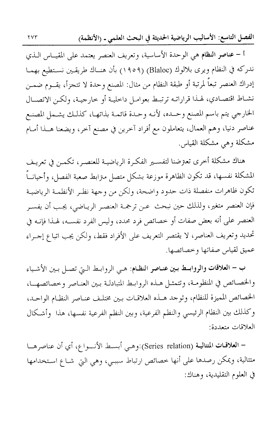 أ- عناصر النظام: هي الوحدة الأساسية، وتعريف العنصر يعتمد على المقياس الذي ندركه في النظام ويرى بلالوك "Blaloc"؛ "1959" بأن هناك طريقين نستطع بهما إدراك العنصر تبعا لمرتبة أو طبقة النظام من مثال: المصنع وحدة لا تتجزأ، يقوم ضمن نشاط اقتصادي، لهذا قراراته ترتبط بعوامل داخلية أو خارجية، ولكن الاتصال الخارجي يتم باسم المصنع وحده، لأنه وحدة قائمة بذاتها، كذلك يشمل المصنع عناصر دنيا، وهم العمال، يتعاملون مع أفراد آخرين في مصنع آخر، ويضعنا هذا أمام مشكلة وهي مشكلة القياس.