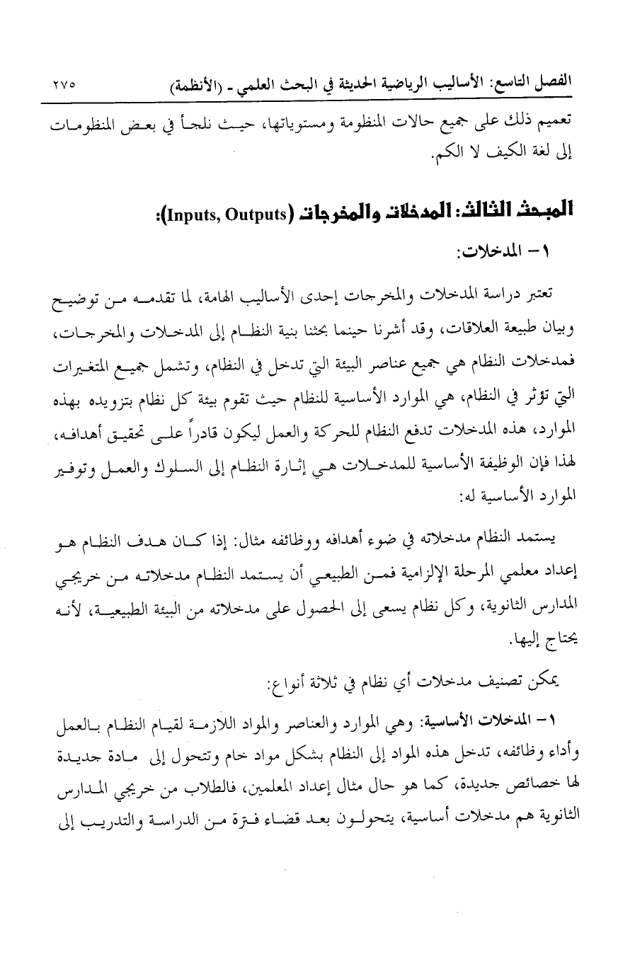 تعتبر دراسة المدخلات والمخرجات إحدى الأساليب الهامة، لما تقدمه من توضيح وبيان طبيعة العلاقات، وقد أشرنا حينما بحثنا بنية النظام إلى المدخلات والمخرجات، فمدخلات النظام هي جميع عناصر البيئة التي تدخل في النظام، وتشمل جميع المتغيرات التي تؤثر في النظام، هي الموارد الأساسية للنظام حيث تقوم بيئة كل نظام بتزويده بهذه الموارد، هذه المدخلات تدفع النظام للحركة والعمل ليكون قادرا على تحقيق أهدافه، لهذا فإن الوظيفة الأساسية للمدخلات هي إثارة النظام إلى السلوك والعمل وتوفير الموارد الأساسية له: