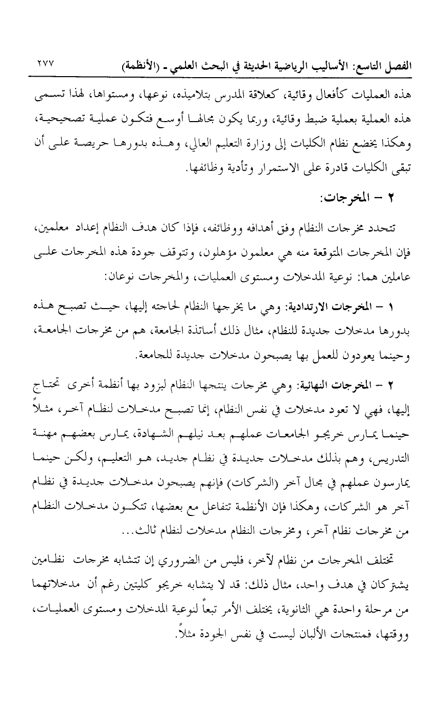2- المخرجات النهائية: وهي مخرجات ينتجها النظام ليزود بها أنظمة أخرى تحتاج إليها، فهي لا تعود مدخلات في نفس النظام، إنما تصبح مدخلات لنظام آخر، مثلا حينما يمارس خريجو الجامعات عملهم بعد نيلهم الشهادة، يمارس بعضهم مهنة التدريس، وهم بذلك مدخلات جديدة في نظام جديد، هو التعليم، ولكن حينما يمارسون عملهم في مجال آخر "الشركات" فإنهم يصبحون مدخلات جديدة في نظام آخر هو الشركات، وهكذا فإن الأنظمة تتفاعل مع بعضها، تتكون مدخلات النظام من مخرجات نظام آخر، ومخرجات النظام مدخلات لنظام ثالث ...