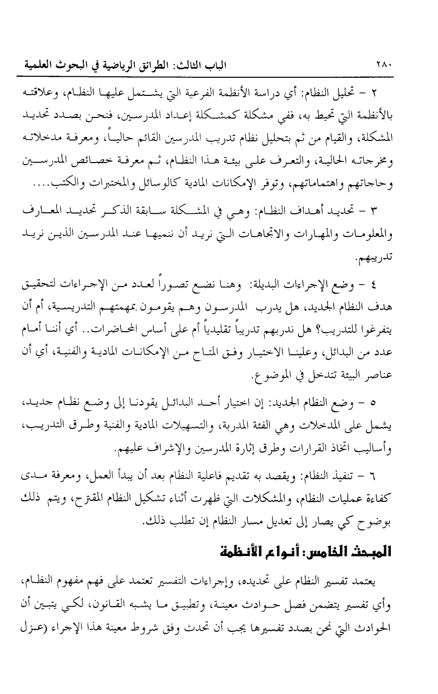 2- تحليل النظام: أي دراسة الأنظمة الفرعية التي يشتمل عليها النظام، وعلاقته بالأنظمة التي تحيط به، ففي مشكلة كمشكلة إعداد المدرسين، فنحن بصدد تحديد المشكلة، والقيام من ثم بتحليل نظام المدرسين القائم حاليا، ومعرفة مدخلاته ومخرجاته الحالية، والتعرف على بيئة هذا النظام، ثم معرفة خصائص المدرسين وحاجاتهم واهتماماتهم، وتوفر الإمكانات المادية كالوسائل والمختبرات والكتب ...