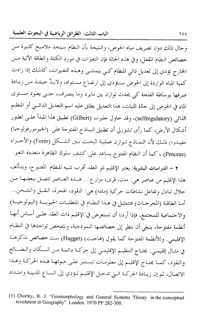وحال ذلك دون تصريف مياه الحوص، والنتيجة بأن النظام سيتخذ ملامح كثيرة من خصائص النظام المقفل، وفي هذه الحالة فإن التغيرات في مورد الكتلة والطاقة الآتية من الخارج تؤدي إلى تعديل ذاتي للنظام كي يتمشى وهذه التغيرات، كذلك إذا زادت كمية المياة الواردة إلى الحوض ستؤدي إلى ارتفاع مستواه، ولا بد حينئذ من زيادة صرفها بوساطة الفتحة كي يحدث توازن بين ما يرد وما ينصرف، حتى يعود مستوى الماء في الحوض إلى حالة الثبات، هذا التعديل يطلق عليه اسم التعديل الذاتي أو المنظم الذاتي "Selfregulatory"، وقد حاول جلبرت "Gilbert" تطبيق هذا المبدأ على تطور أشكال الأرض، كما رأي تشورلي أن تطبيق النماذج المفتوحة على "الجيومورفولوجيا" مفيد1 ذلك لأن النماذج توازن عملية البحث بين الشكل "Form" والأجزاء "Process"، كما أن النظام المفتوح يساعد على كشف سلوك الظاهرة متعددة التغير.