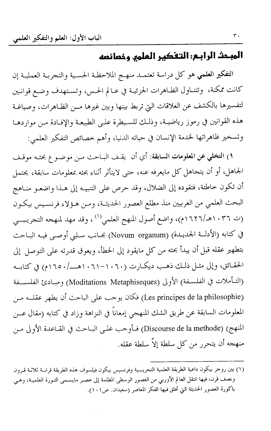 1 بين روجر بيكون داعية الطريقة العلمية التجريبية وفرنسيس بيكون فيلسوف هذه الطريقة قرابة ثلاثة قرون ونصف قرون، فيها انتقل العالم الأوروبي من العصور الوسطى المظلمة إلى عصر ما يسمى الثورة العلمية، وهي باكورة العصور الحديثة التي تخلق فيها الفكر المعاصر "سعيدان. ص101".