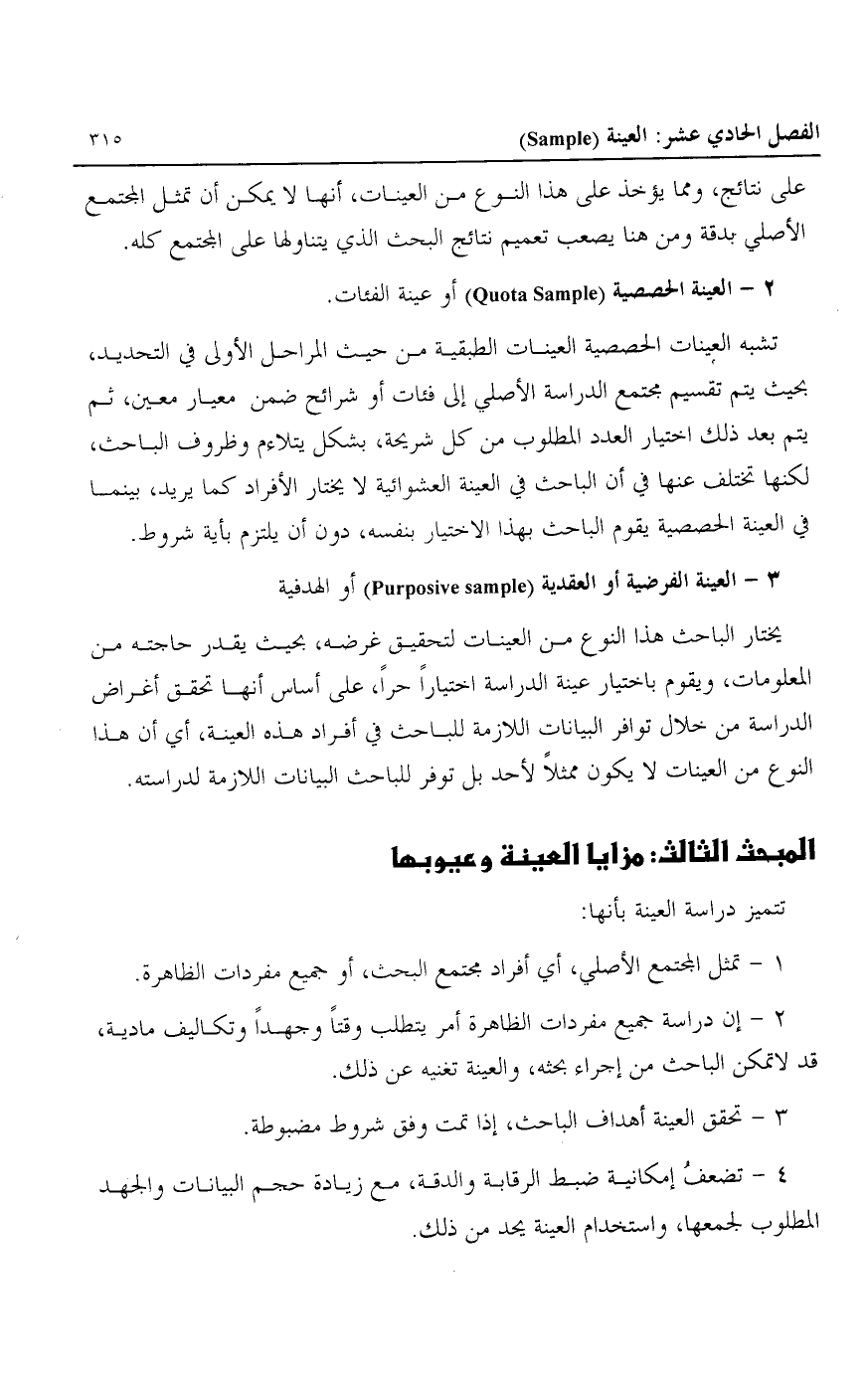 على نتائج، ومما يؤخذ على هذا النوع من العينات، أنها لا يمكن أن تمثل المجتمع الأصلي بدقة ومن هنا يصعب تعميم نتائج البحث الذي يتناولها على المجتمع كله.