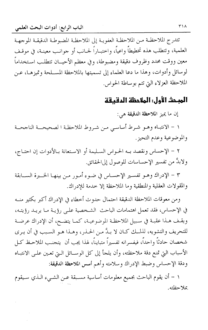 ومن معوقات الملاحظة الدقيقة احتمال حدوث أخطاء في الإدراك أكبر بكثير منه في الإحساس، فقد تعمل اهتمامات الباحث الشخصية على رؤية ما يريد رؤيته، ويقف هذا عقبة في سبيل الملاحظة الموضوعية، كما يتضح، أن الإدراك عرضة للتحريف والتشويه، لذلك كان لا بد من الحذر، وهذا هو السبب في أن يرى شخصان حادثا واحدا، فيفسرانه تفسيرا متباينا، لهذا يجب أن يتجنب الملاحظ كل الأسباب التي يمنع دقة ملاحظته، وأن يلجأ إلى كل الوسائل التي تعين على الانتباه ودقة الإحساس وضبط الإدراك وسلامته وأهم أسس الملاحظة الدقيقة: