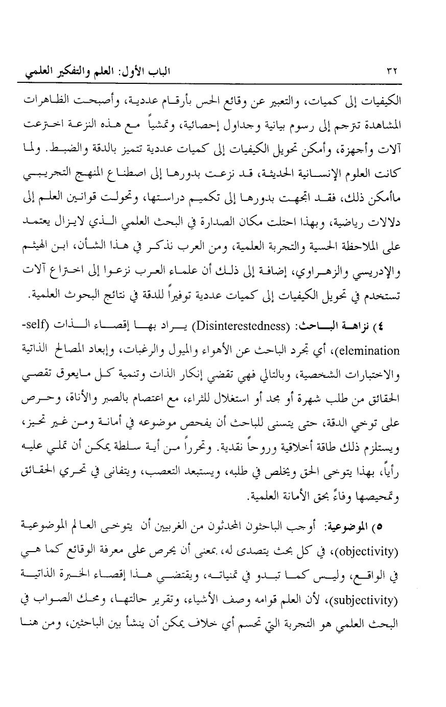 5- الموضوعية: أوجب الباحثون المحدثون من الغربيين أن يتوخى العالم الموضوعية "Objectivity" في كل بحث يتصدى له بمعنى أن يحرص على معرفة الوقائع كما هي في الواقع، وليس كما تبدو في تمنياته، ويقتضي هذا إقصاء الخبرة الذاتية "Subjectivity" لأن العلم قوامه وصف الأشياء، وتقرير حالتها، ومحك الصواب في البحث العلمي هو التجربة التي تحسم أي خلاف يمكن أن ينشأ بين الباحثين، ومن هنا