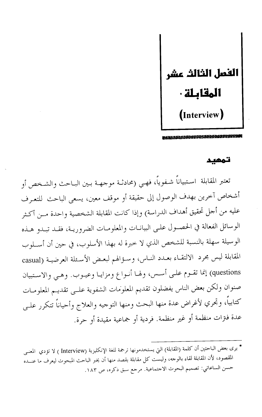 1 يرى بعض الباحثين أن كلمة "المقابلة" التي يستخدمونها ترجمة للغة الإنكليزية "Interview" لا تؤدي المعنى المقصود، لأن المقابلة لقاء بالوجه، وليست كل مقابلة يقصد منها أن يخبر الباحث المبحوث ليعرف ما عنده. حسن الساعاتي: تصميم البحوث الاجتماعية. مرجع سبق ذكره، ص183.