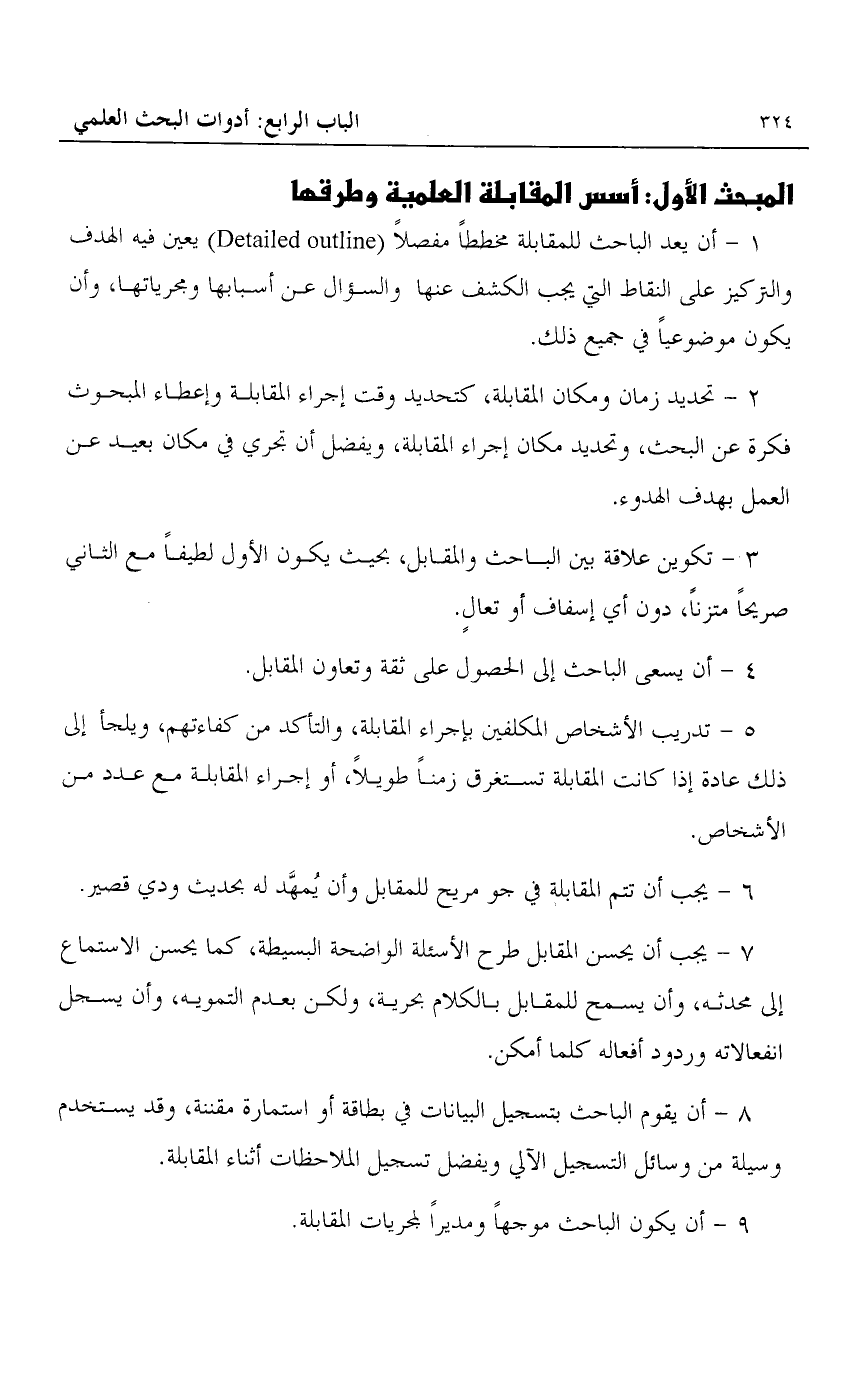1- أن يعد الباحث للمقابلة مخططا مفصلا" "Detailed outline" يعين فيه الهدف والتركيز على النقاط التي يجب الكشف عنها والسؤال عن أسبابها ومجرياتها، وأن يكون موضوعيا في جميع ذلك.