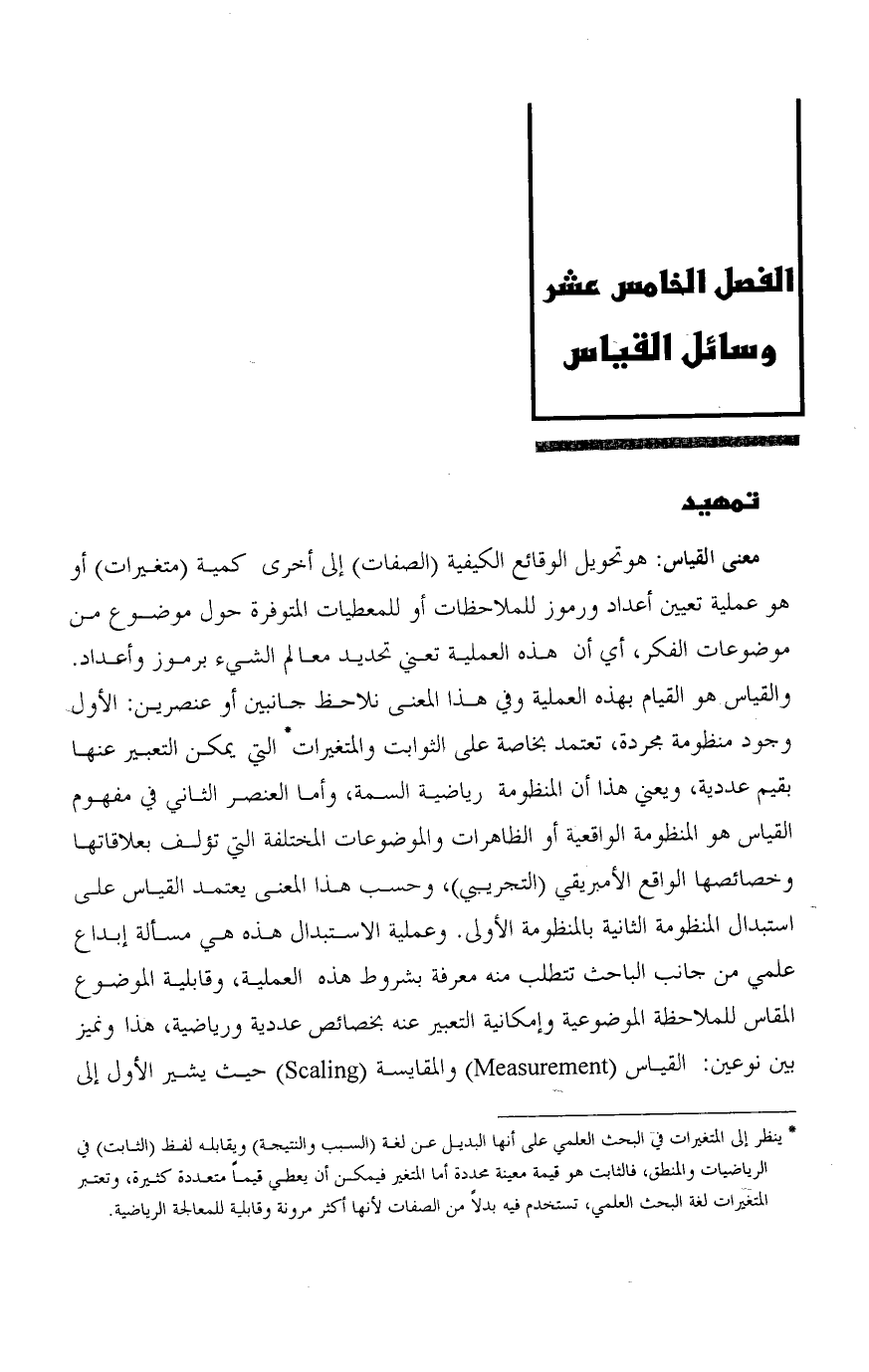 معنى القياس: هو تحويل الوقائع الكيفية "الصفات" إلى أخرى كمية "متغيرات" أو هو عملية تعيين أعداد ورموز للملاحظات أو للمعطيات المتوفرة حول موضوع من موضوعات الفكر، أي أن هذه العملية تعني تحديد معالم الشيء برموز وأعداد والقياس هو القيام بهذه العملية وفي هذا المعنى نلاحظ جانبين أو عنصرين: الأول وجود منظومة مجردة، تعتمد بخاصة على الثوابت والمتغيرات1 التي يمكن التعبير عنها بقيم عددية، ويعني هذا أن المنظومة رياضية السمة، وأما العنصر الثاني في مفهوم القياس هو المنظومة الواقعية أو الظاهرات والموضوعات المختلفة التي تؤلف بعلاقاتها وخصائصها الواقع الأمبريقي "التجريبي"، وحسب هذا المعنى يعتمد القياس على استبدال المنظومة الثانية بالمنظومة الأولى. وعملية الاستبدال هذه هي مسألة إبداع علمي من جانب الباحث تتطلب منه معرفة بشروط هذه العملية، وقابلية الموضوع المقاس للملاحظة الموضوعية وإمكانية التعبير عنه بخصائص عددية ورياضية، هذا ونميز بين نوعين: القياس "Measurement" والمقايسة "Scaling" حيث يشير الأول إلى