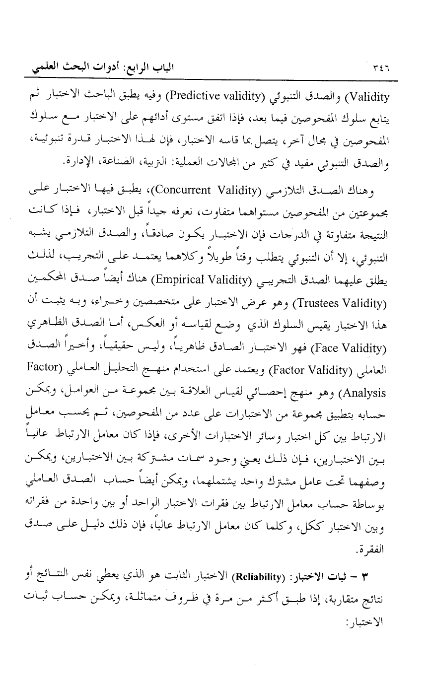 Validity" والصدق التنبوئي "predivive validity" وفيه يطبق الباحث الاختبار ثم يتابع سلوك المفحوصين فيما بعد، فإذا اتفق مستوى أدائهم على الاختبار مع سلوك المفحوصين في مجال آخر، يتصل بما قاسه الاختبار فإن لهذا الاختبار قدرة تنبوئية، والصدق التنبؤي مفيد في كثير من المجالات العملية: التربية، الصناعة، الإدارة.